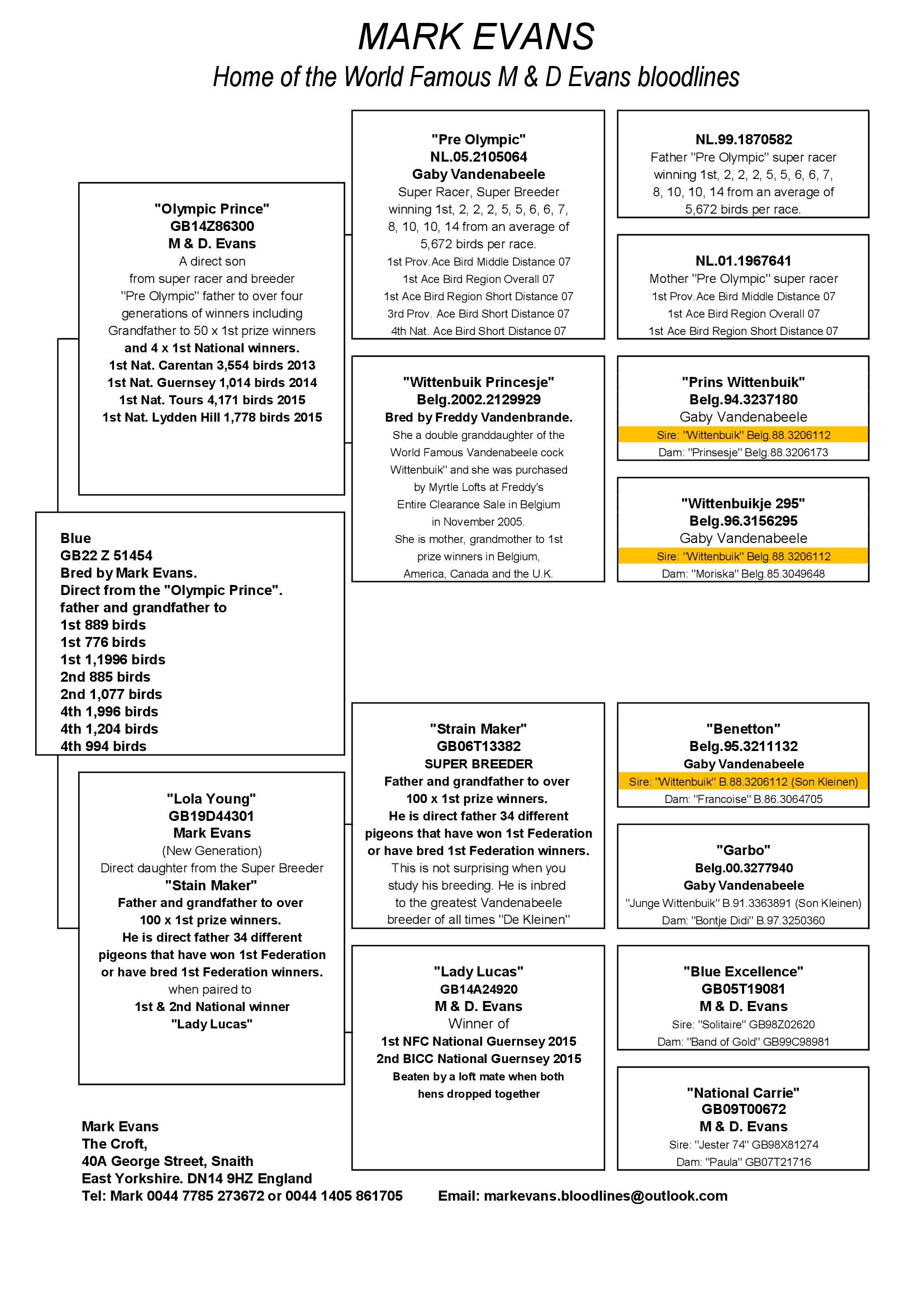 SIRE: “Olympic Prince” GB14Z86300 – father, grandfather to 1st 889 birds, 1st 776 birds, 1st 1,1996 birds, 2nd 885 birds, 2nd 1,077 birds, 4th 1,996 birds, 4th 1,204 birds, 4th 994 birds, 5th 887 birds, 8th 1,323 birds, 10th 1,783 birds. “Olympic Prince” is a direct son from super racer and breeder “Pre-Olympic” “Pre-Olympic” winner of: 1st Strombeek 4,679 birds, 2nd Meer 5,497 birds, 2nd Duffel 4,694 birds, 2nd Strombeek 3,949 birds, 5th Meer 3,582 birds, 5th Nijvel 2,336 birds, 6th Nijvel 4,461 birds, 6th Morlincourt 2,377 birds, 7th Chantilly 9,565 birds, 8th Duffel 24,807 birds, 10th Peronne 2,349 birds, 10th Peronne 1,774 birds, 14th Chimay 3,666 birds, 20th Meer 19,826 birds, 22nd Strombeek 11,809 birds, 28th Nijvel 3,992 birds, 31st Strombeek 23,935 birds, 33rd Meer 27,750 birds, 51st Nijvel 12,673 birds, 51st Peronne 9,181 birds, 63rd Nijvel 23,698 birds, 75th Peronne 12,370 birds Total winner of 33 prizes in his racing career. “Pre-Olympic” is father of over 4 generations of winners, 50 x 1st prize winners including grandfather to 6 x 1st Nat. winners. Here is an example of his direct children. “Levi Young” mother to “Shadow’s Image” 1st BICC Nat. Tours 482 members / 4,187 birds, “Olympic 599” father to “Lady Olympic” 1st BICC Nat. Guernsey Old Hens 1,014 birds, “Olympic Lady” mother to “Lady Olympic” 1st BICC Nat. Guernsey Old Hens 1,014 birds. Also 1st Nat. Carentan 3,554 birds, 1st Nat. Lydden Hill 1,778 birds. DAM: “Lola Young” GB19D44301 – Direct daughter from the Super Breeder “Stain Maker” Father and grandfather to over 100 x 1st prize winners. He is direct father 34 different pigeons that have won 1st Federation or have bred 1st Federation winners. when paired to 1st & 2nd National winner “Lady Lucas”.