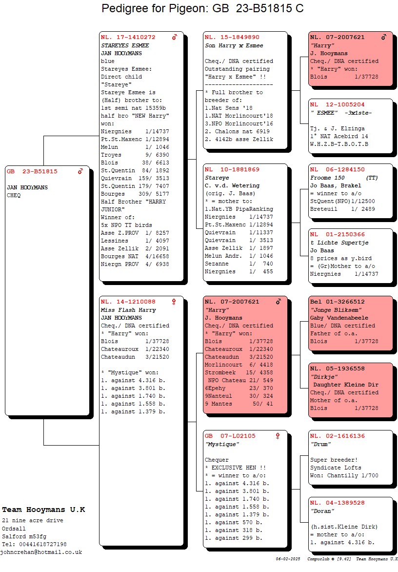 A direct daughter of the legendary “Harry” (NL 07-2007621), one of the greatest breeders of all time. But what makes this dam truly special is that she is the mother of “Mystique” (GB 07-L02105), an exclusive racing hen with phenomenal performances, including: