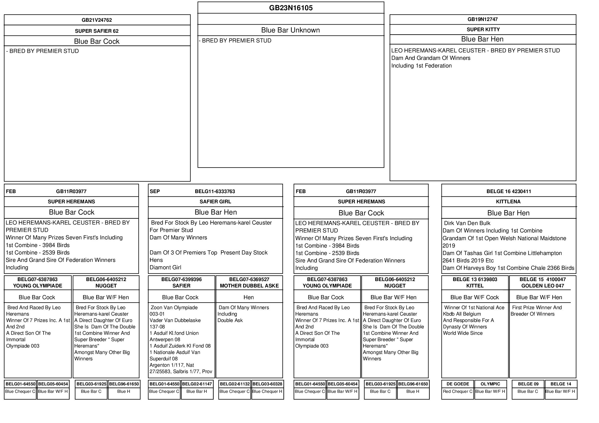 SIRE GB 21 V24762 “Super Safier 62” his father is Hereman-Cuesters and has won 1st Combine 3,864b and 1st Combine 2,539b and he is sire and grand sire to Federation winners. The mother to Super Safier 62 is a daughter of the Safier cock X The mother to Dubbel Aske.