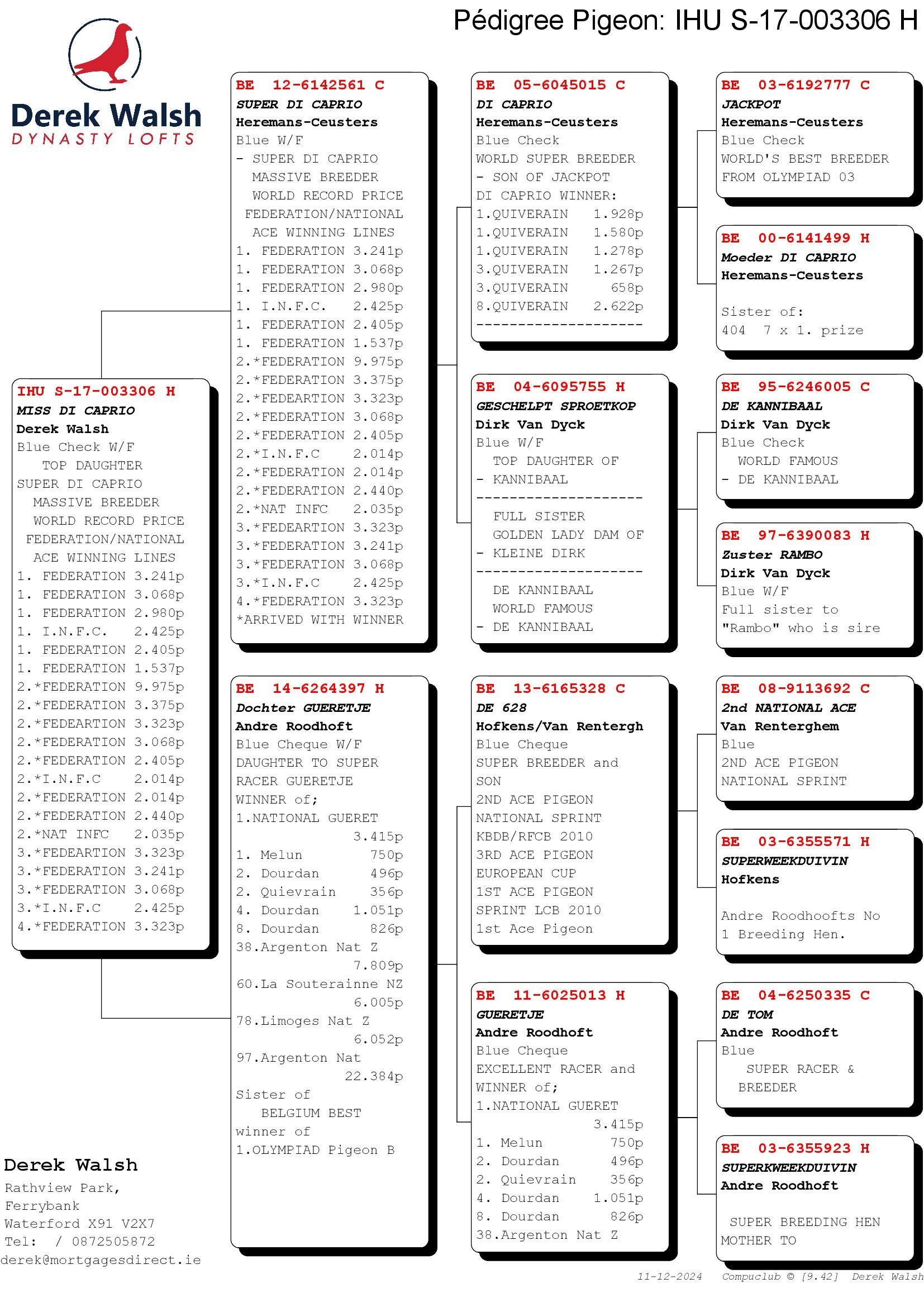 IHU 17-S003306 Cheq WF Hen “Miss Di Caprio” she is a granddaughter of Di Caprio and a granddaughter of Sproetkop, which is a daughter from the legendary super pigeon De Kannibaal when he was coupled with the daughter of Rambo.