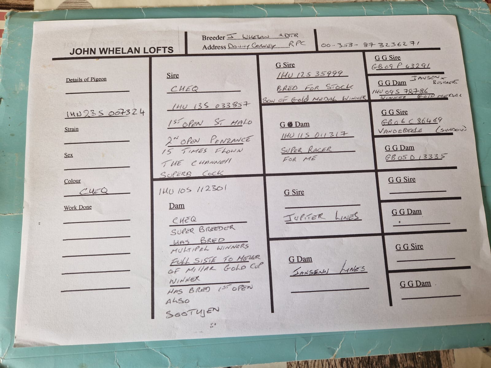 IHU 13 S033857 he won 1st Open St Malo, 2nd Open Penzance and he flew the channel into Ireland on 15 separate occasions. He is a mix of Vandenabeel, Janssen and Busschaert, in fact his grandfather is “Shadow”