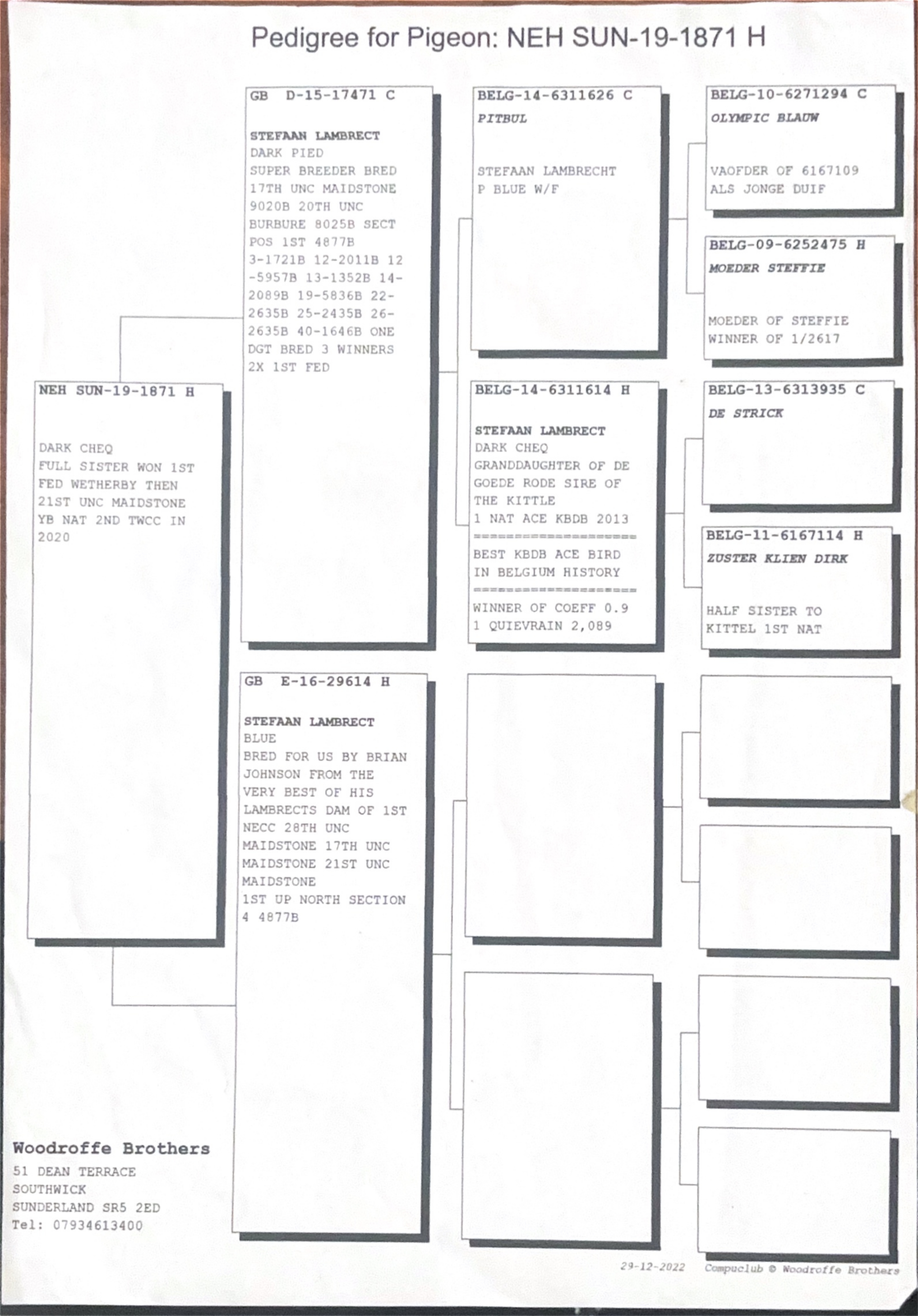 GB 16 E29614 bred by Brain Johnson from the best of his Stefaan Lambrechts; she is the mother to 1st NECC, 28th UNC Maidstone, 17th UNC and 21st UNC Maidstone 4 from 4,877b.