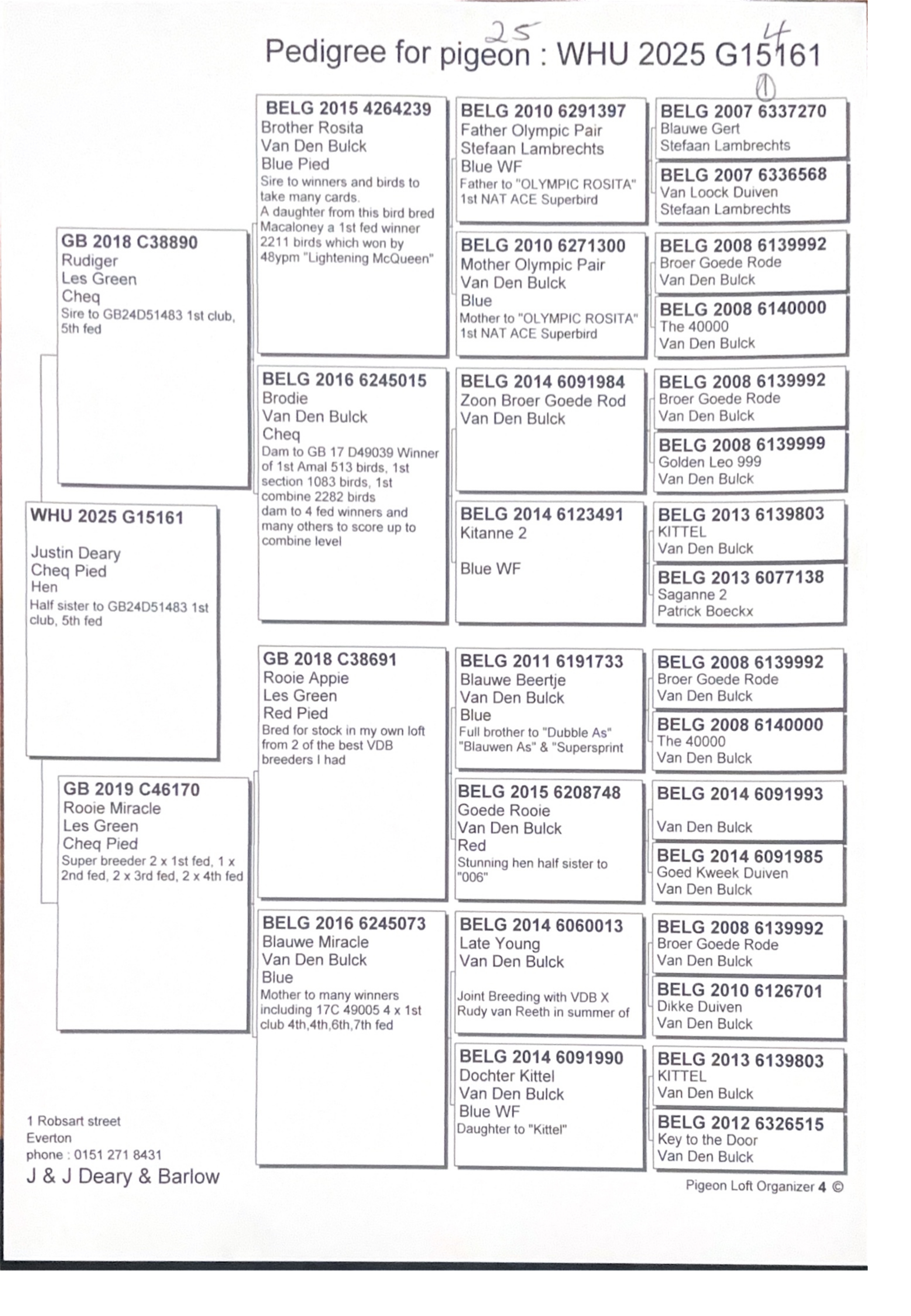 she is 100% Van Den Bulck bloodlines from the best lines possible. Both of her parents were bred by Les Green from all the lines that brought him, and others, so much success at the highest level. This hen is a granddaughter to Brother Rosita, Brodie, Rooie Appie and Blauwe Miracle.