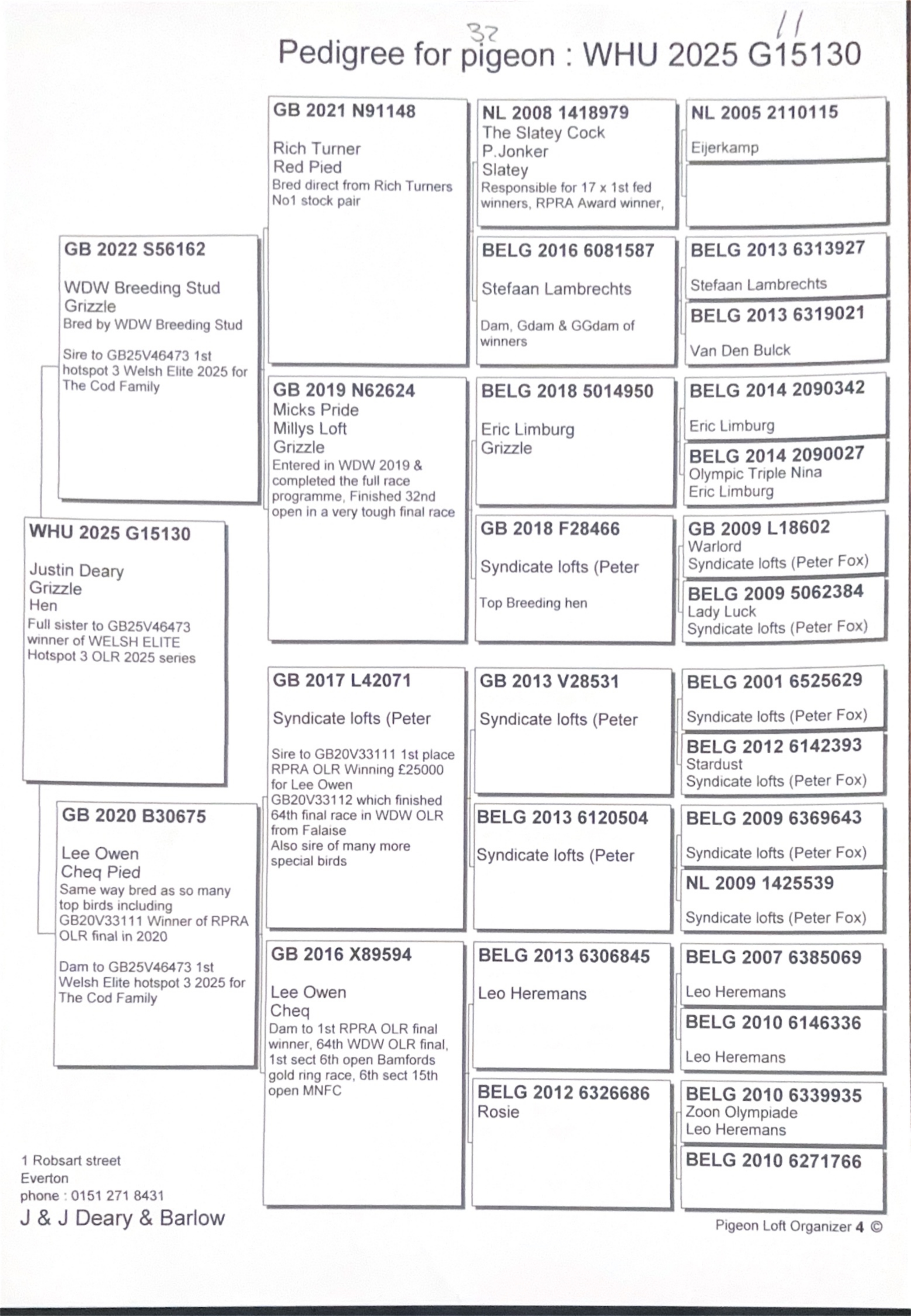 WHU 25 G15130 Grizzle Hen “Storm Olivia” she is a full sister to 25 V46473, winner of Welsh Elite OLR Hotspot 3 race and to the nest mate 46472, which finished 24th Ace Pigeon for Justin and 56th Hotspot 1, 18th Semi-Final and 24th Final Race.