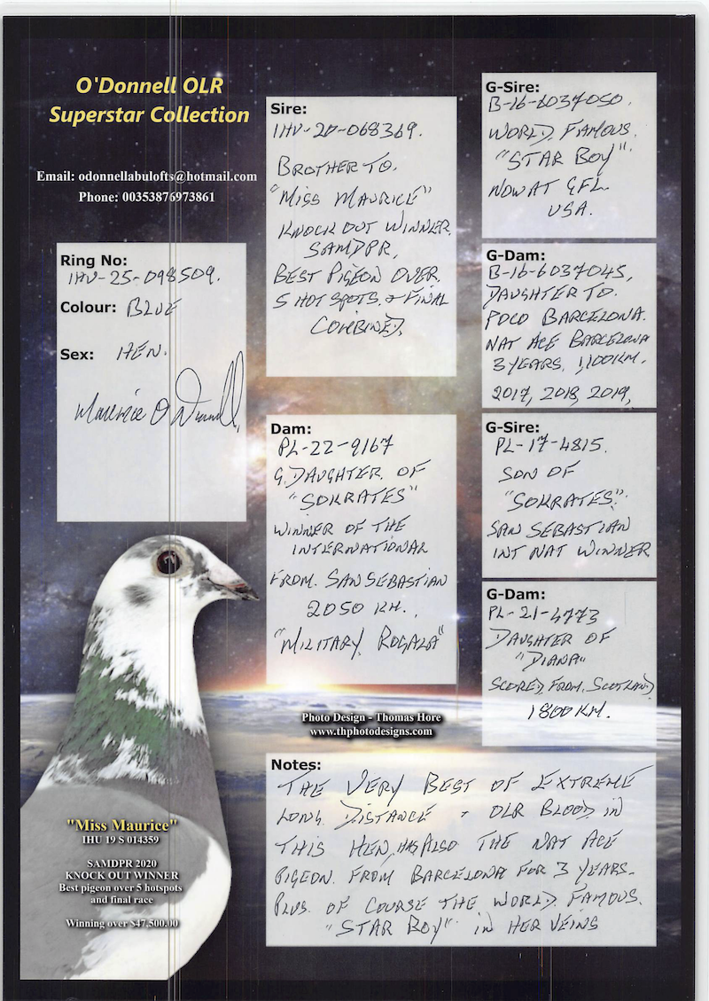 - Elite One Loft Race performance from the legendary Star Boy × Miss Maurice dynasty