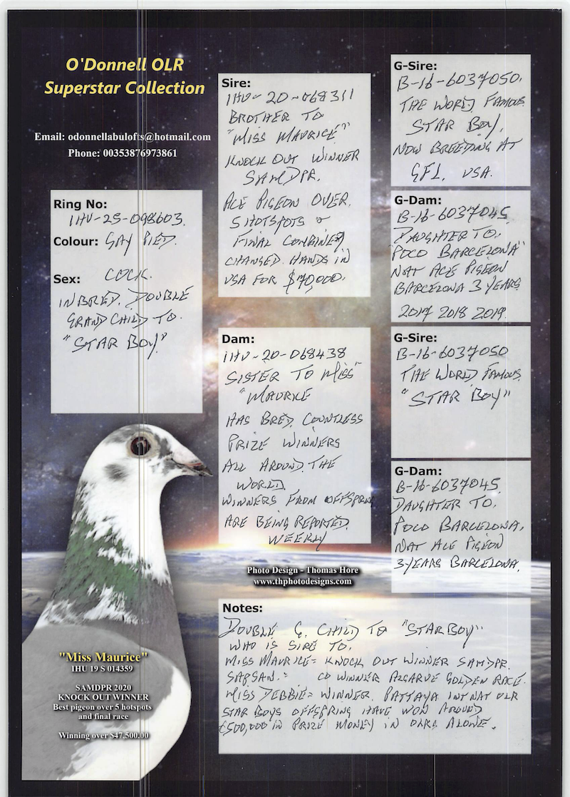 The sire is a direct full brother to Miss Maurice, one of the greatest One Loft Race pigeons ever raced.
