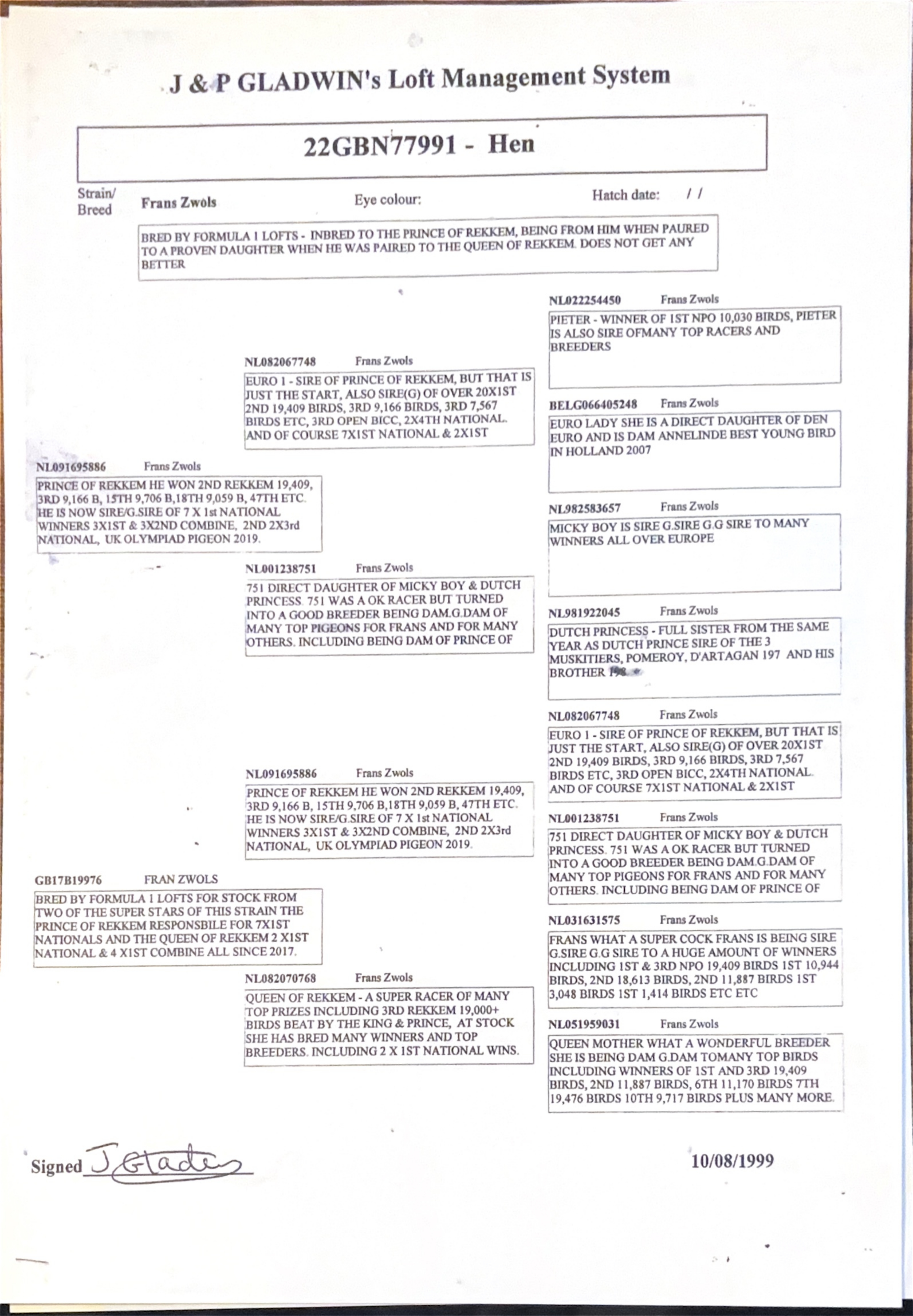 Queen Of Rekkem is a super racer and won many top prizes including 3rd Rekkem 19,000b only behind the 2 loft mates, being the Prince and King of Rekkem.