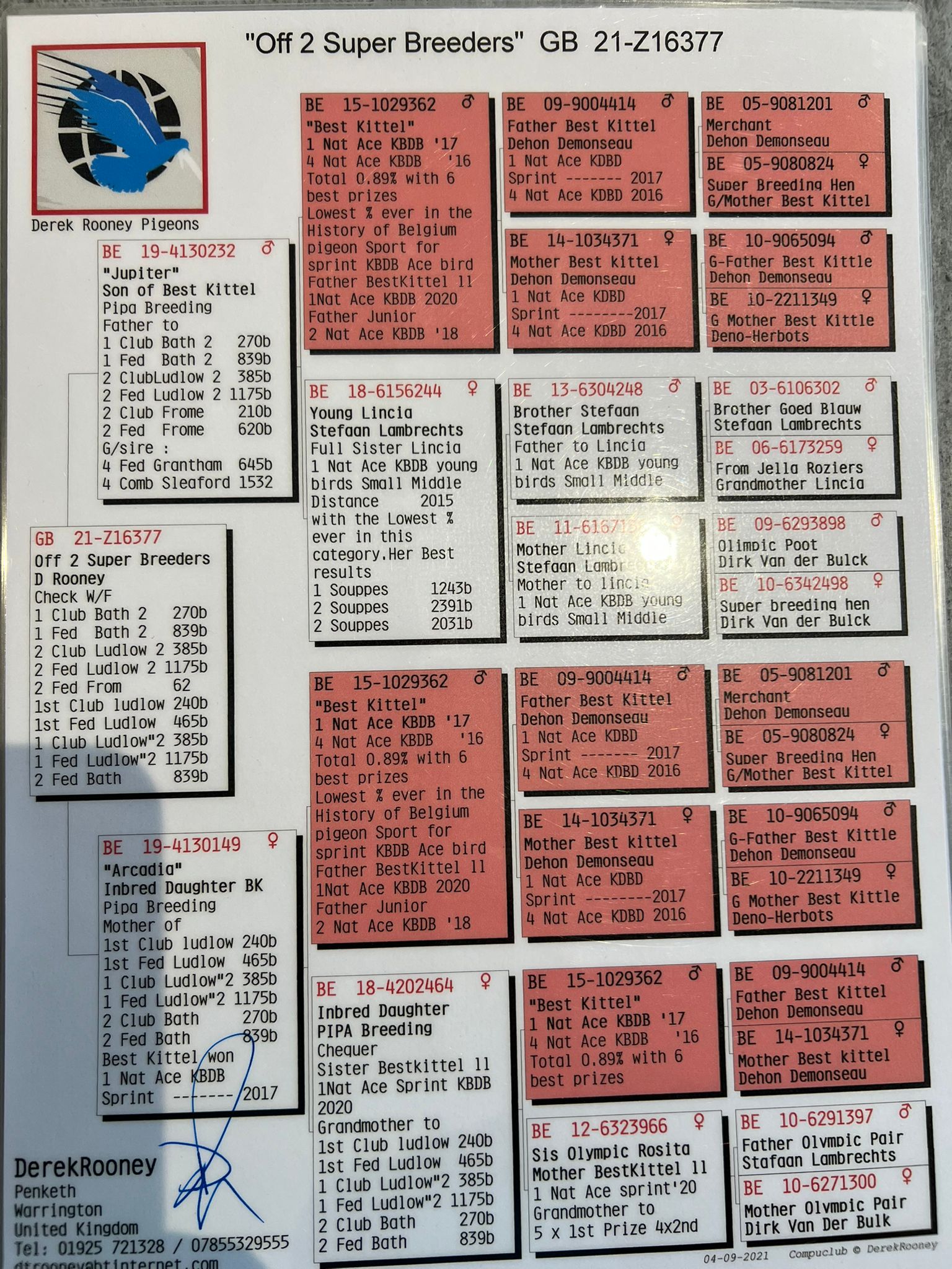Belge 19 4130232 “Jupiter” he is a direct son of Best Kittel X Young Lincia, the full sister to Lincia, 1st Nat Ace KBDB SMD for Stefaan Lambrechts. World class bloodlines and successful wherever they go.