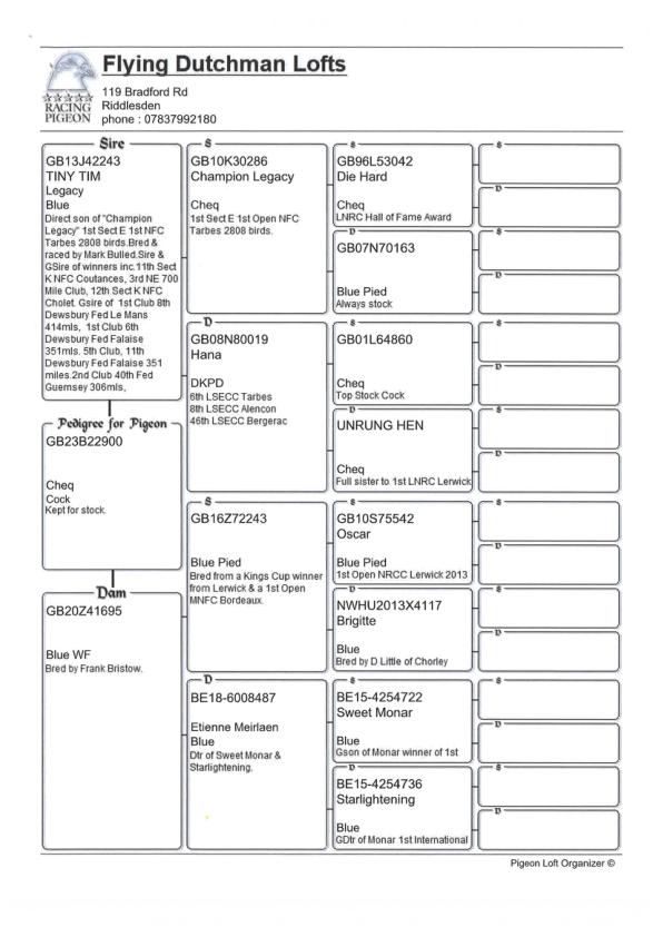 GB 17 32200 Ace stock cock and a direct son of “Isla’s Rainy Day Boy” a winner of 1st International Pau, 1st BIOCC Pau 3.-011b, 3rd Open BICC Narbonne in 2010 and 27th Open BICC Tarbes in 2010.