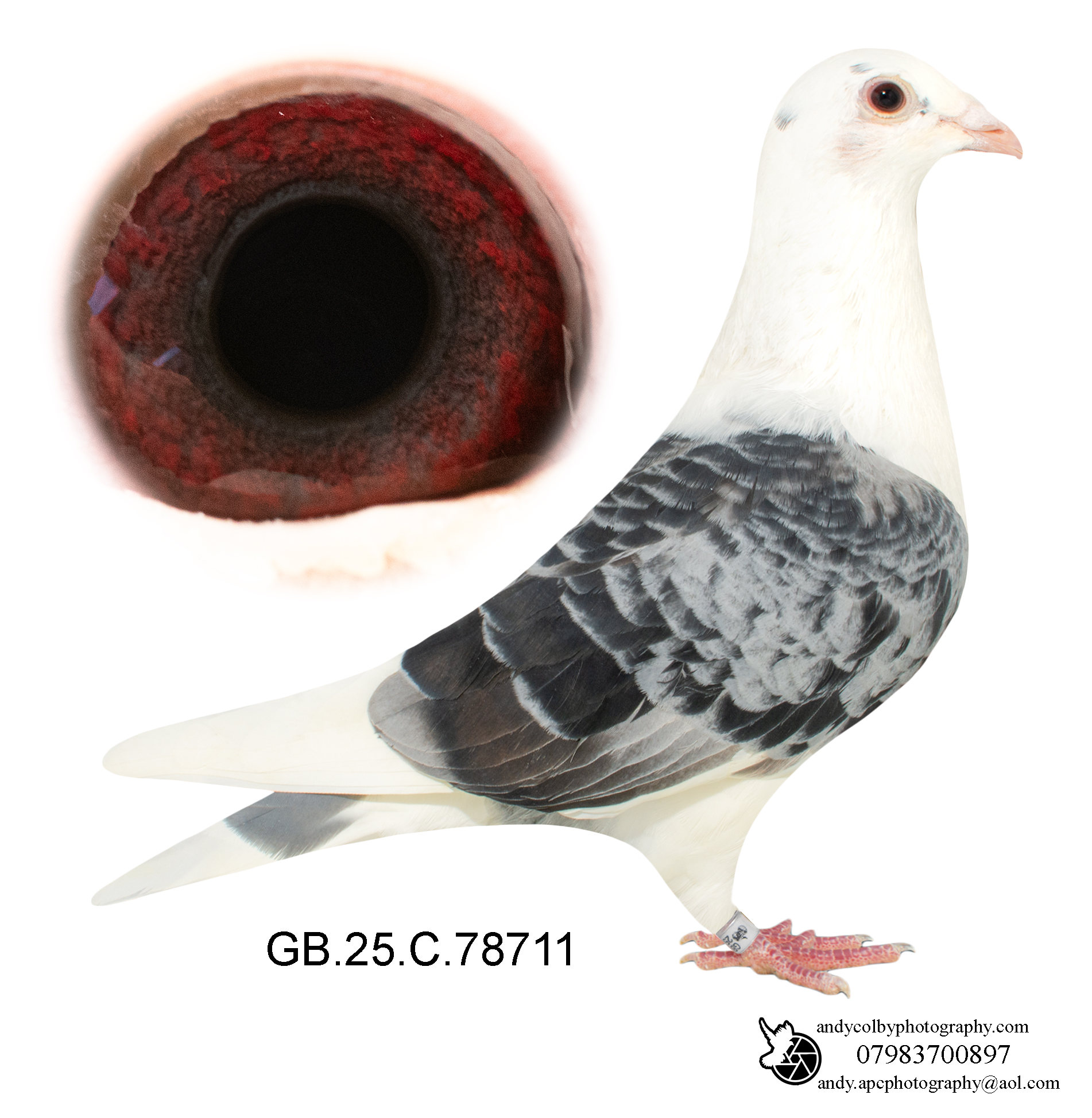 GB 25 C78711 Chequer Pied Cock “Planters Elleven” he will become a very classy pigeon. He is a beautiful young cock, and he is a nephew to “Planters Lynnie” the 1st Ace Pigeon, 3rd Final. 1st Knock-out Shropshire OLR 2023.