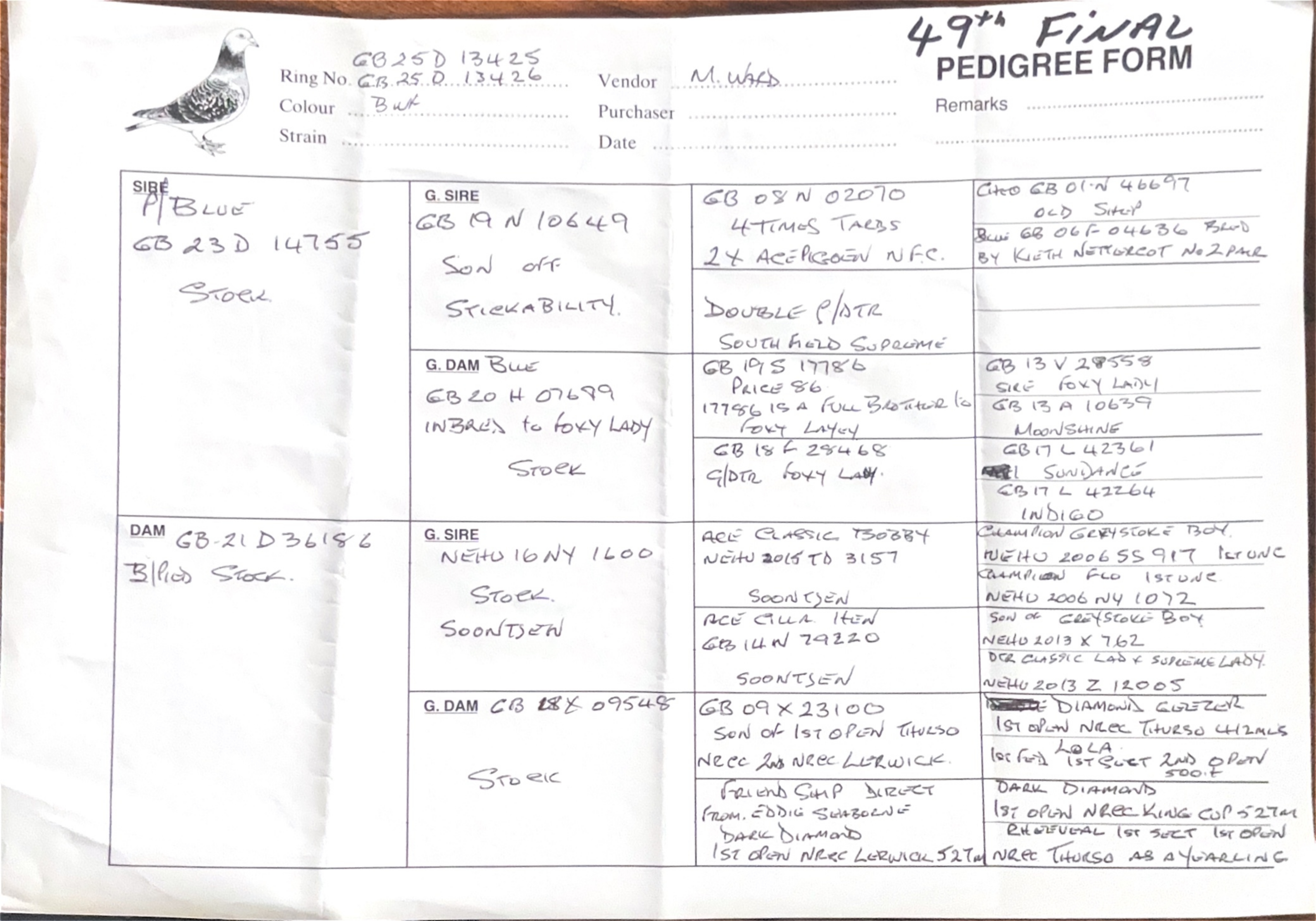 GB 23 D14755 his father is 10649 bred from a 4 times Tarbes and 2 X Ace Pigeon NFC winner and an Inbred Foxy Lady hen that come from a full brother to son of Foxy Lady X a granddaughter of Foxy Lady.