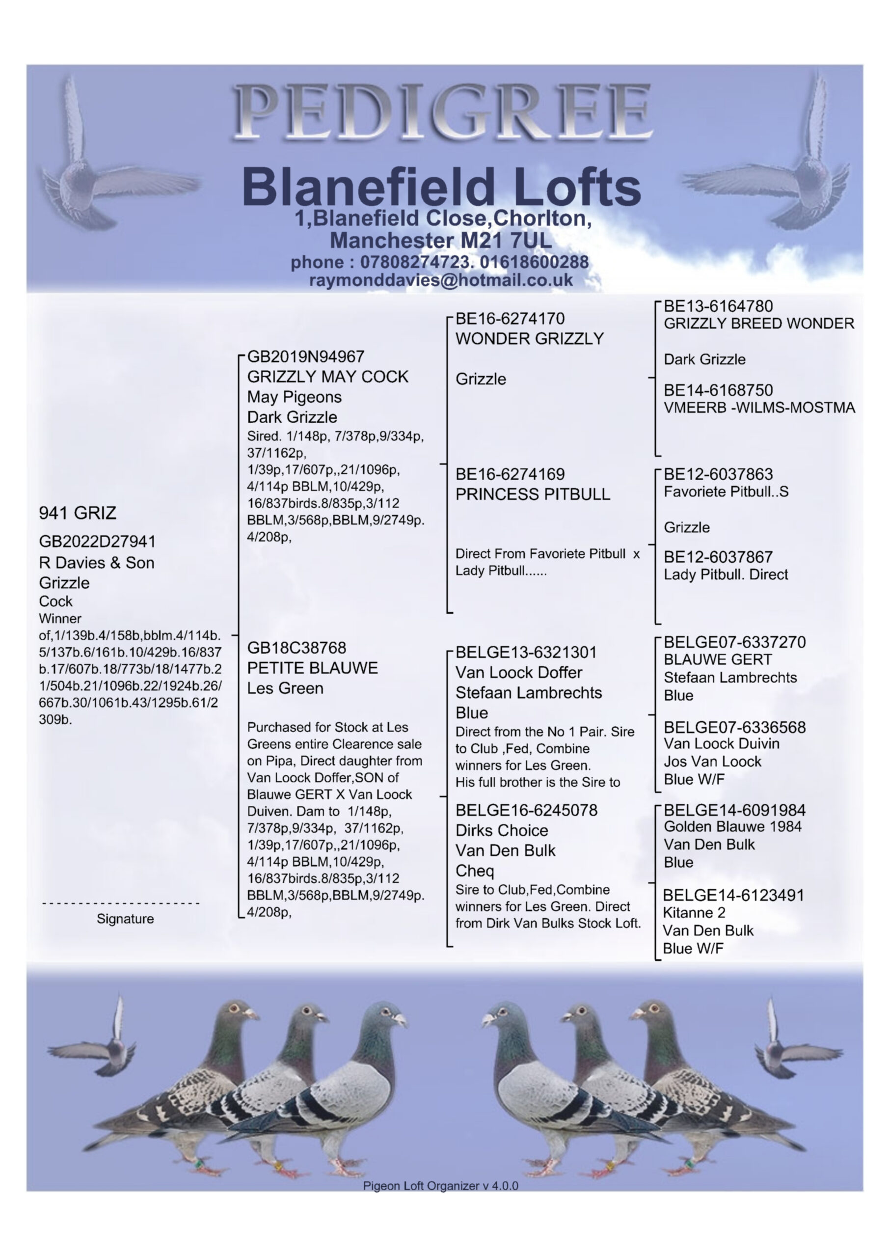 GB 22 D27941 “941 Griz” he is a retired racer and a winner of 1st 139b, 4th 158b bblm, 4th 114b, 5th 137b, 6th 161b, 10th 429b, 16th 837b, 17th 607b, 18th 773b, 18th 1,477b, 21st 504b, 21st 1,096b, 22nd 1,924b, 26th 667b, 30th 1,061b, 43rd 1,295b and 61st 2,309b.