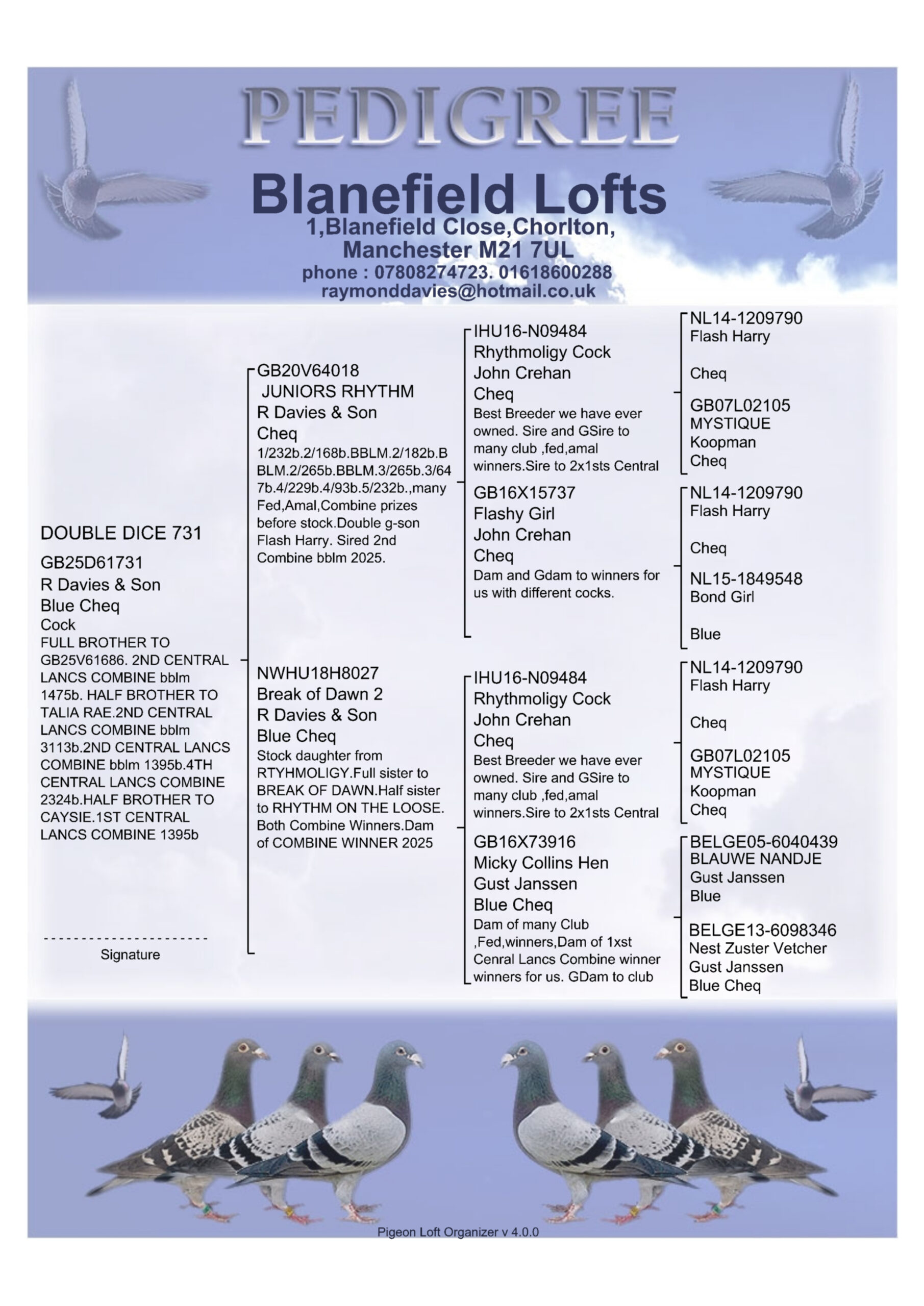 GB 25 D61731 Cheq Cock “Double Dice 731” he is a full brother to 25 V61686 a winner of 2nd Open Central Lancs Combine bblm 1,475b, he is also half-brother to Talia Rae, the winner of 2nd Open Central Lancs Combine bblm against 3,113b, 2nd Central Lancs Combine bblm 1,395b, 4th Central Lancs Combine 2,324b and half-brother to ‘Caysie’ the winner of 1st Central Lancs Combine 1,395b.