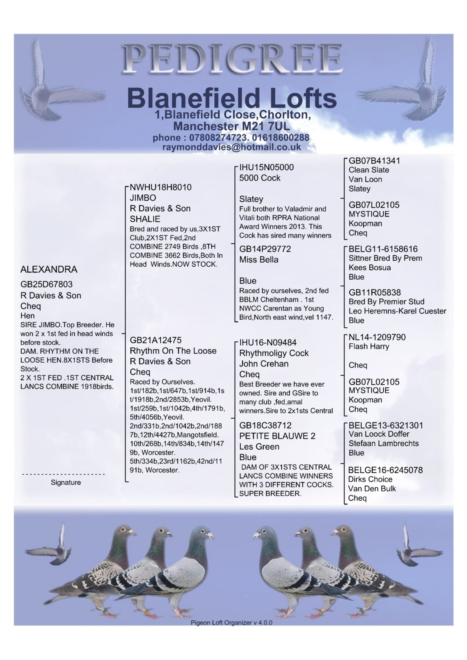 The mother to “Jimbo” is a hen that won 1st NW Classic Club from Carentan as a YB in a North East wind and a velocity of 1147ypm and 2nd Fed Beat by a loft mate from Cheltenham; she is a Kees Bosua X Heremans-Cuesters pigeon.