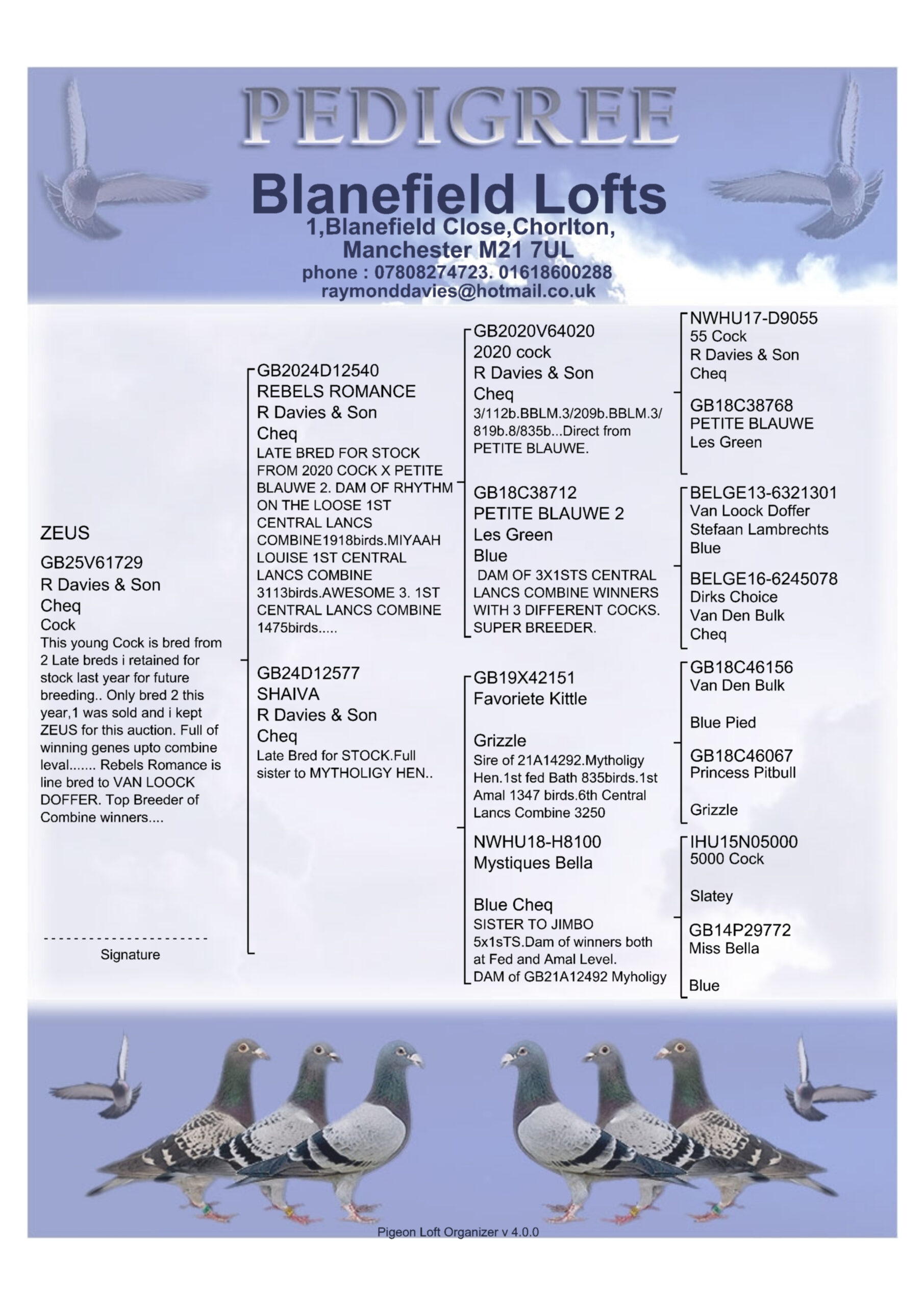 GB 25 V61729 Cheq Cock “Zeus” this young cock is bred from 2 pigeons the lads retained for stock last year for their future breeding plan. They only bred 2 from them this year, one was sold, and Zeus was kept specially for this auction, he is an awesome specimen. He is full of Combine winning genes.