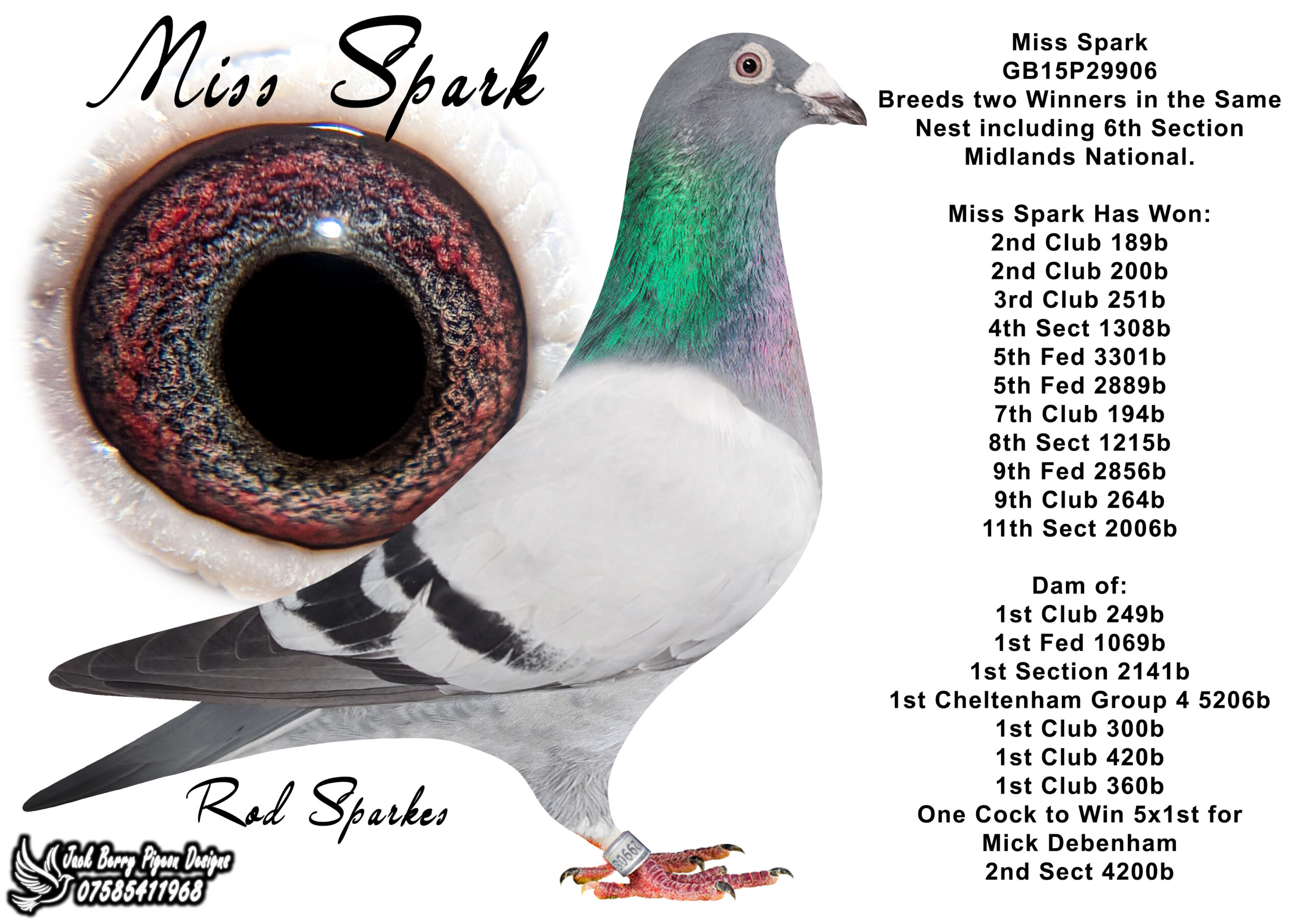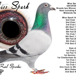 GB 15 P29906 “Miss Spark” she has won 2nd club 189b, 2nd club 200b, 3rd club 251b, 4th Section 1,308b, 5th Fed 3,301b, 5th Section 1,452b, 5th Fed 2,889b, 7th Club 194b, 8th Section 1,215b, 9th Fed 2,856b, 9th club 264b and 11th Section 2,006b. She is also the mother to 1st club 249b, 1st Fed 1,069b, 1st Section 2,141b, 1st Cheltenham Group 4, 5,206b, 1st club 300b and 1st club 420b.