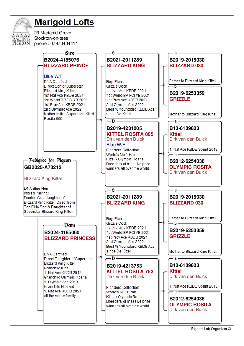 This exceptional lineage guarantees outstanding racing performance, with each generation consistently producing top-tier competitors renowned for their speed and resilience. The combination of these celebrated bloodlines ensures that ‘Blue Storm’ not only boasts a remarkable pedigree, but also possesses the genetic attributes needed to excel at the highest levels of pigeon sport in the UK and beyond.