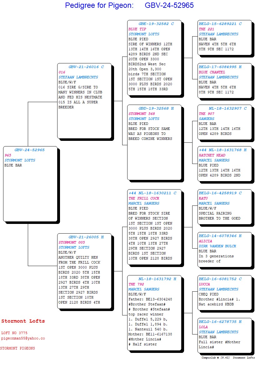 GB 24 V52965 Blue “Stormont 965” another super offer bred from all that is golden within the Van Den Bulck and Stefaan Lambrechts line of top sprint pigeons.