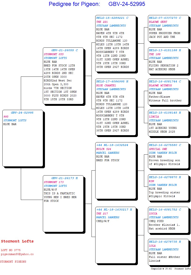 GB 21 V26055 “Stormont 055” a full brother to many of the lofts top breeders and direct from ‘The 221 X Blue Chantel’. He is a brother to fed and combine winners and he is a grandson of the famous “Blauwe Gert” and “Lincia” his father is ‘The 221’ bred from Blauwe Gert X The 188 of Stefaan’s, which was the 2nd National Ace KBDB. Blauwe Gert is ther father to the famous Jackpot, a winner of 7 X 1st and largely responsible for the incredible line of Rosita & Kittel of Dirk Van Den Bulck.
