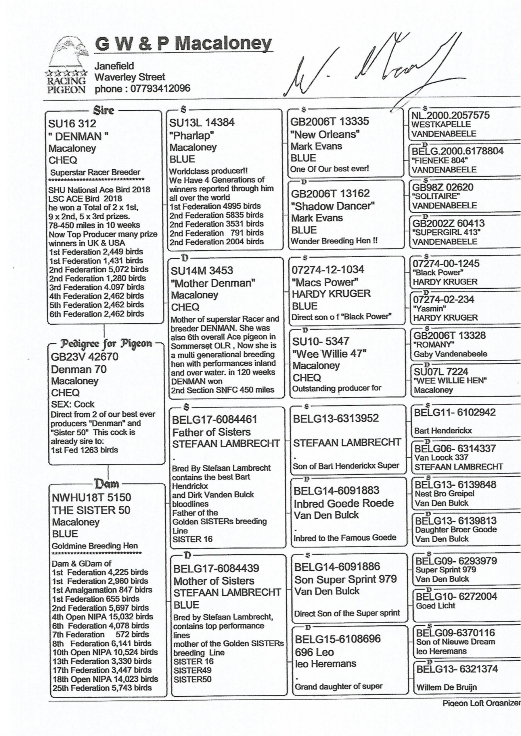 Sire: “Denman 70” GB23V 42670 bred by G W & P Macaloney – original pedigree on display.