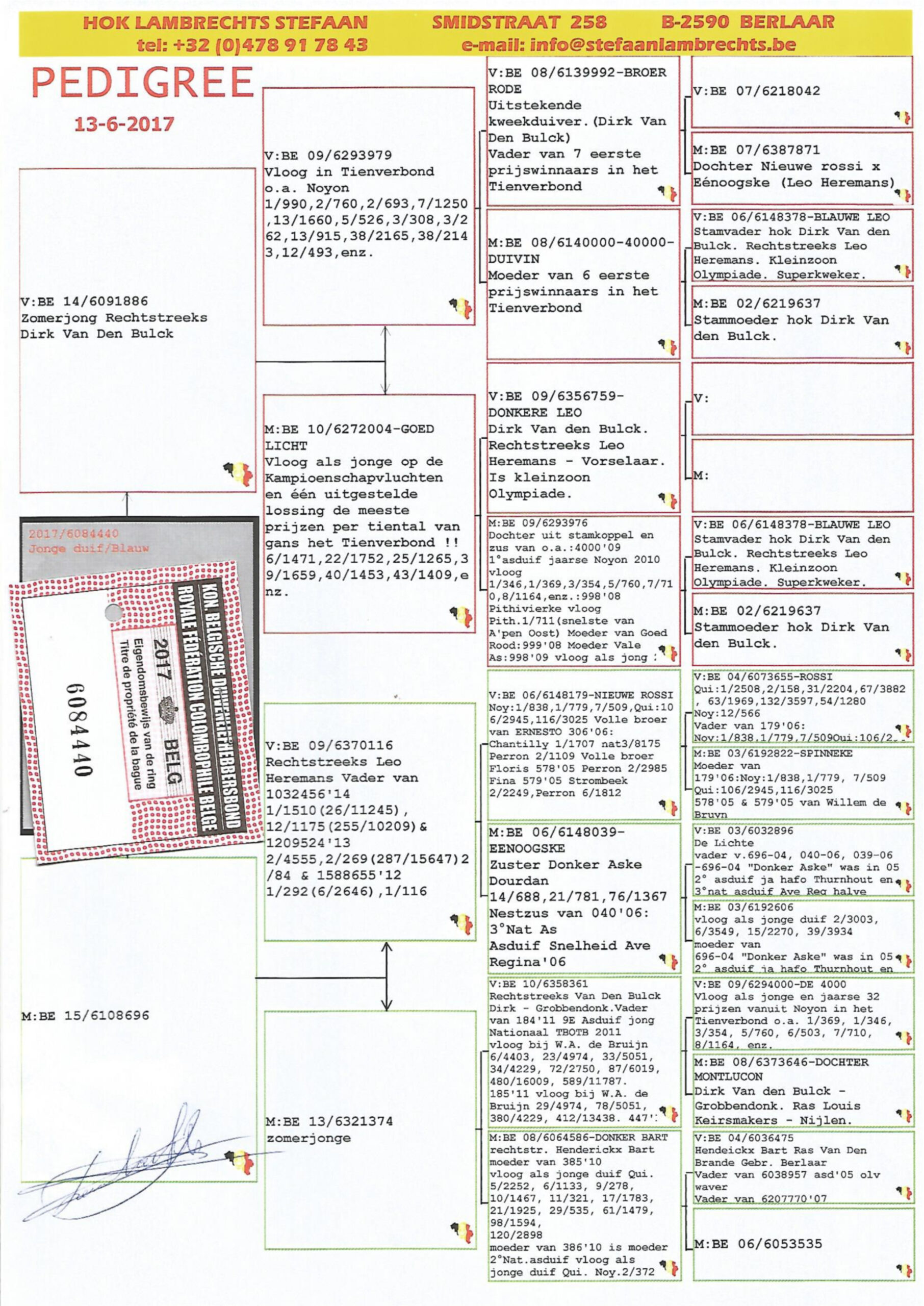 Blue hen BELG17-6084440 bred by Stefaan Lambrechts – original pedigree on display.