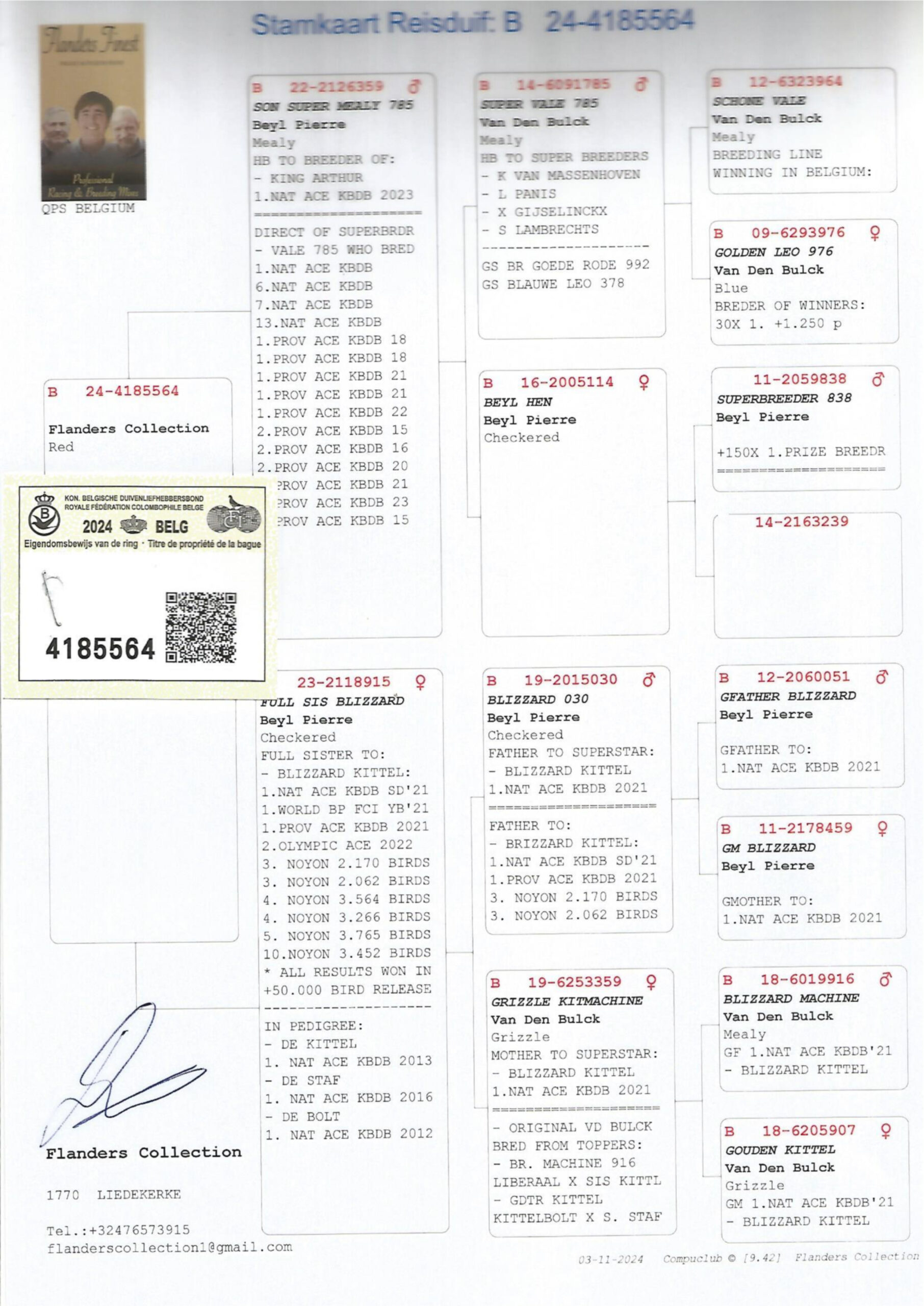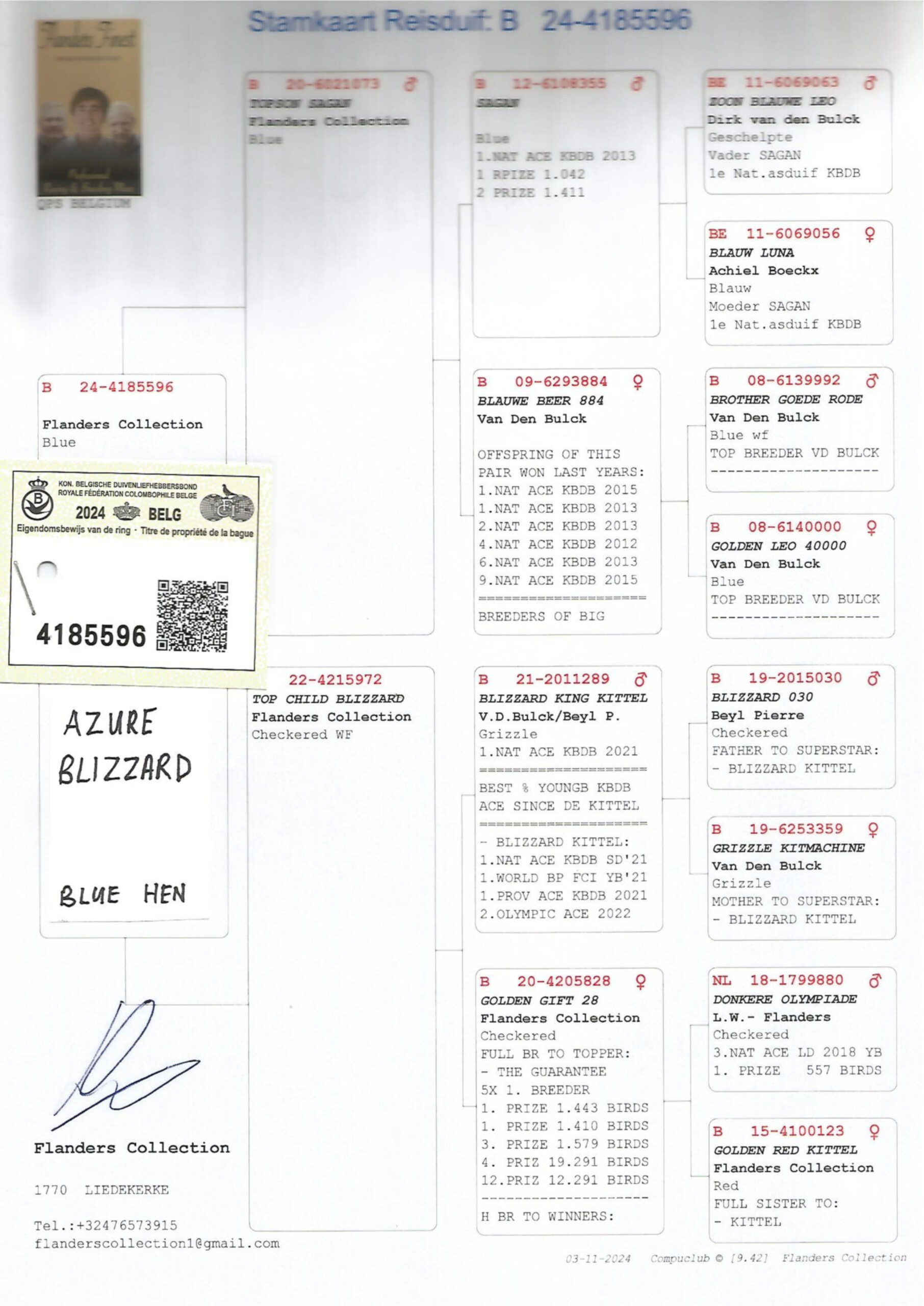Dam to “Blue Blizzard” is “Azure Blizzard” BELG24-4185596 bred by Yannik at Flander Collection –