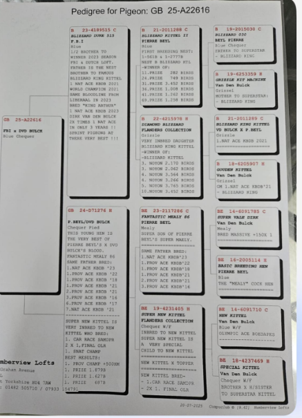 22616 is from the very best of the Dirk Van den Bulck dynasty, the sire Belg 23 4189515 is