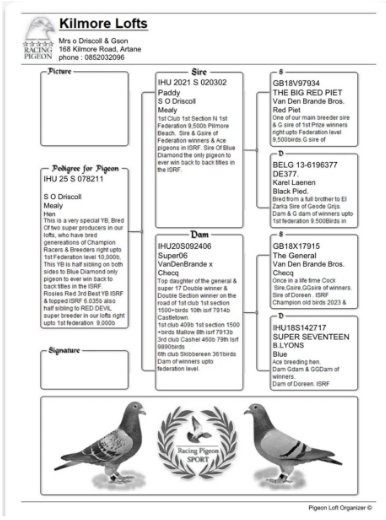 Sean O’Driscoll – One of Irelands top racing lofts. The performances put up by this