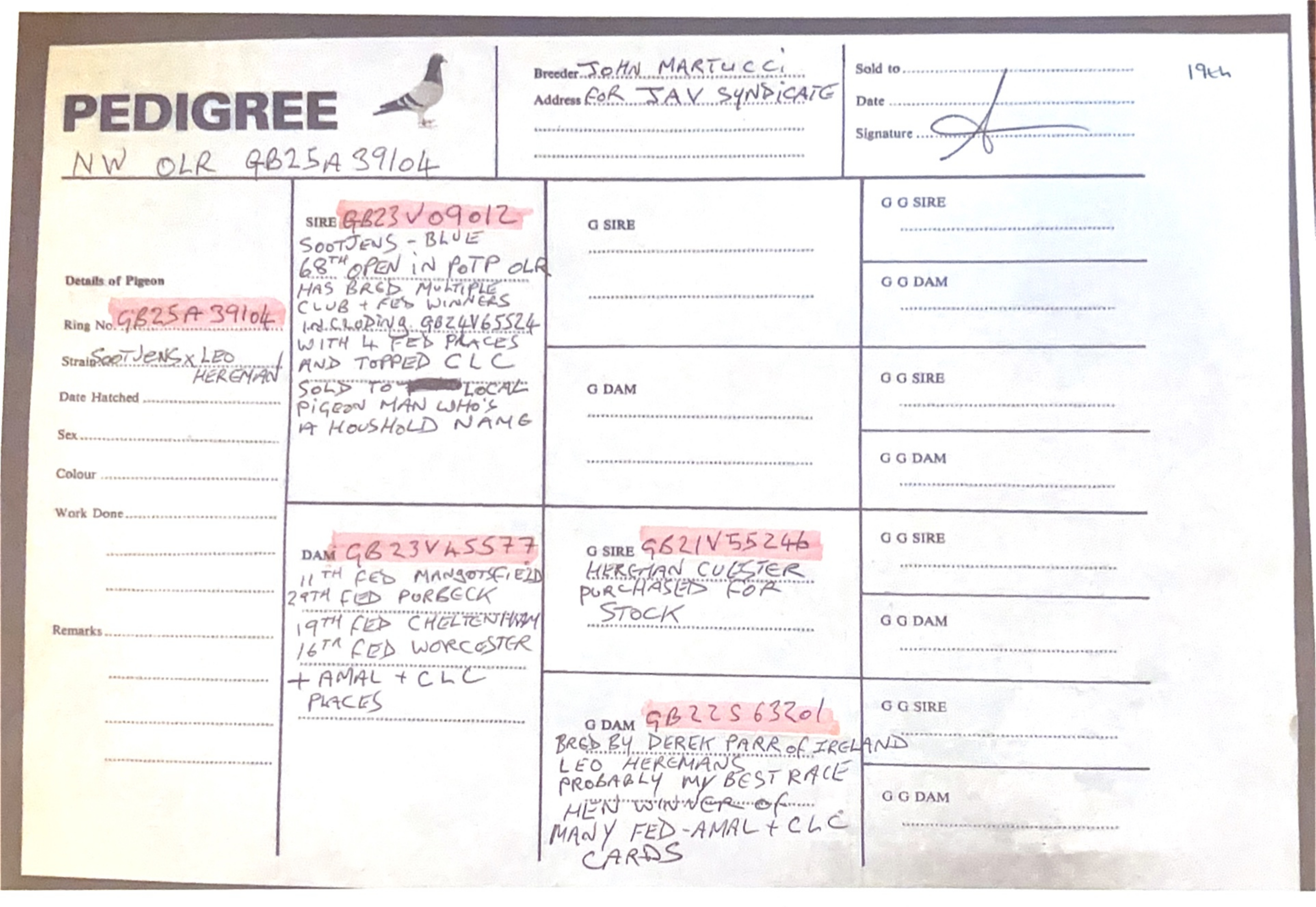 GB 23 V45577 winner of 11th Fed Mangotsfield, 29th Fed Purbeck, 19thb Fed Cheltenham, 16th Fed Worcester plus Amal and combine places. She is Heremans-Cuesters bloodlines and her mother was bred by Derek Parr of Ireland; she is probably the best race hen in the loft with many Fed, Amal and Central Lancs Combine cards against top competition.