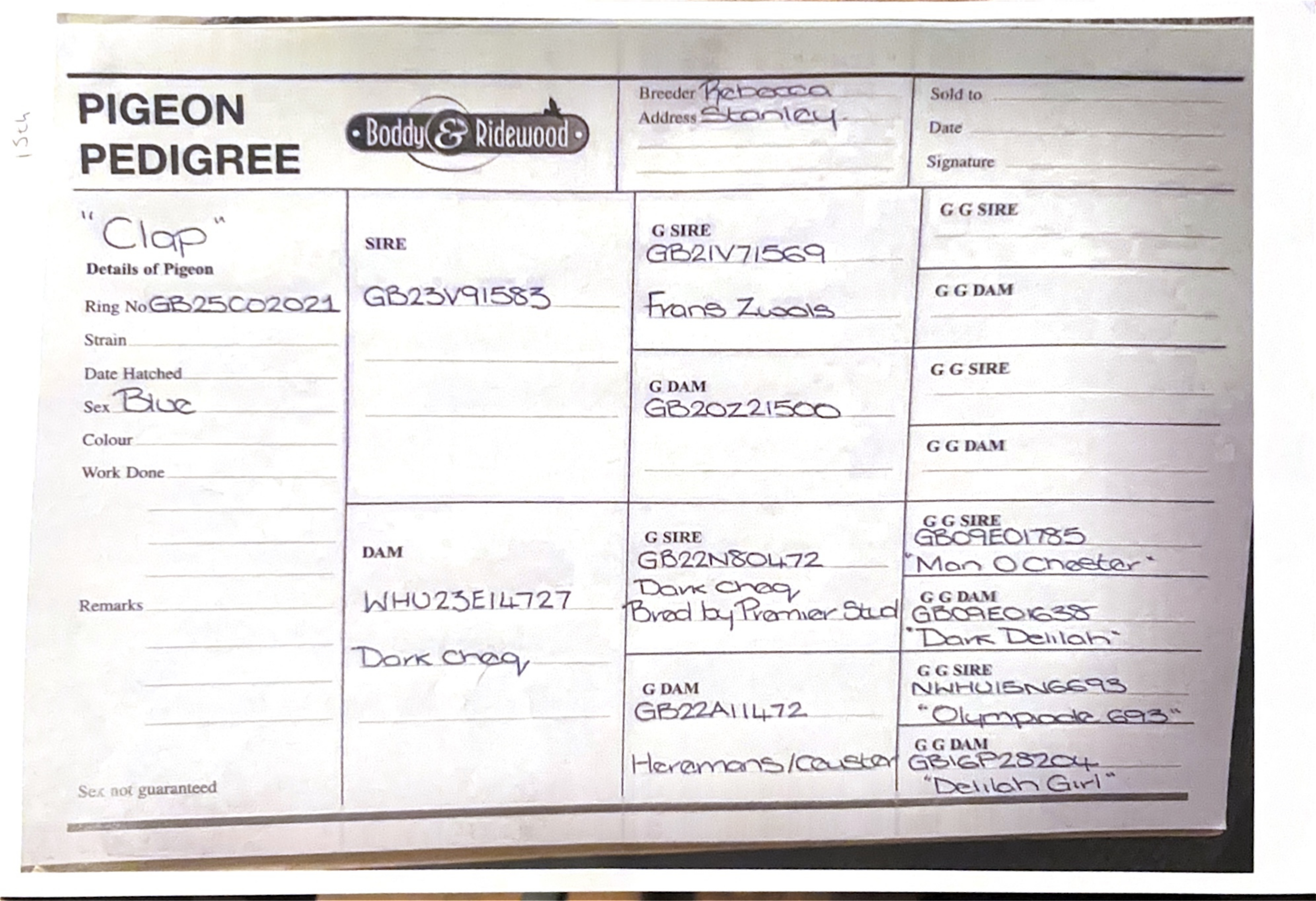 GB 25 C02021 Blue Hen “Clap” winner of 15th Open Grand Final Yeovil and 41st ACE PIGEON winning 11th HS1, 104th HS2, 68th HS3 and 23rd Semi-Final. She is a very nice hen that improved as the distance got further.