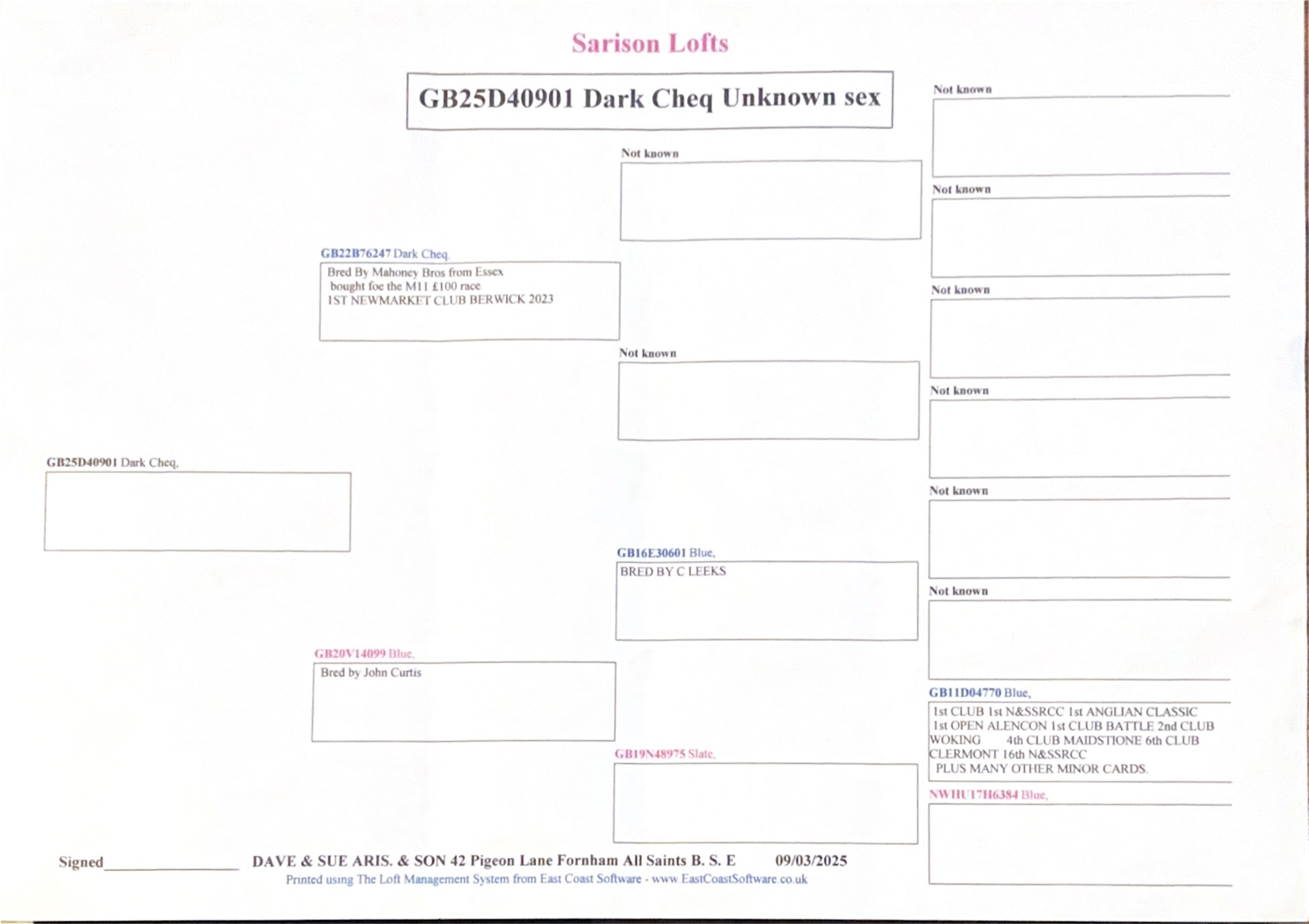 GB 20 V14099 Blue Hen bred by John Curtis, her father was bred by C. Leeks and her mother is off the winner of 1st Club, 1st N&SSRCC 1st Anglian Classic, 1st Open Alencon, 1st Club Battle, 2nd Club Woking, 4th Club Maidstone, 6th Club Clermont and 16th N&SSRCC plus many other minor cards.