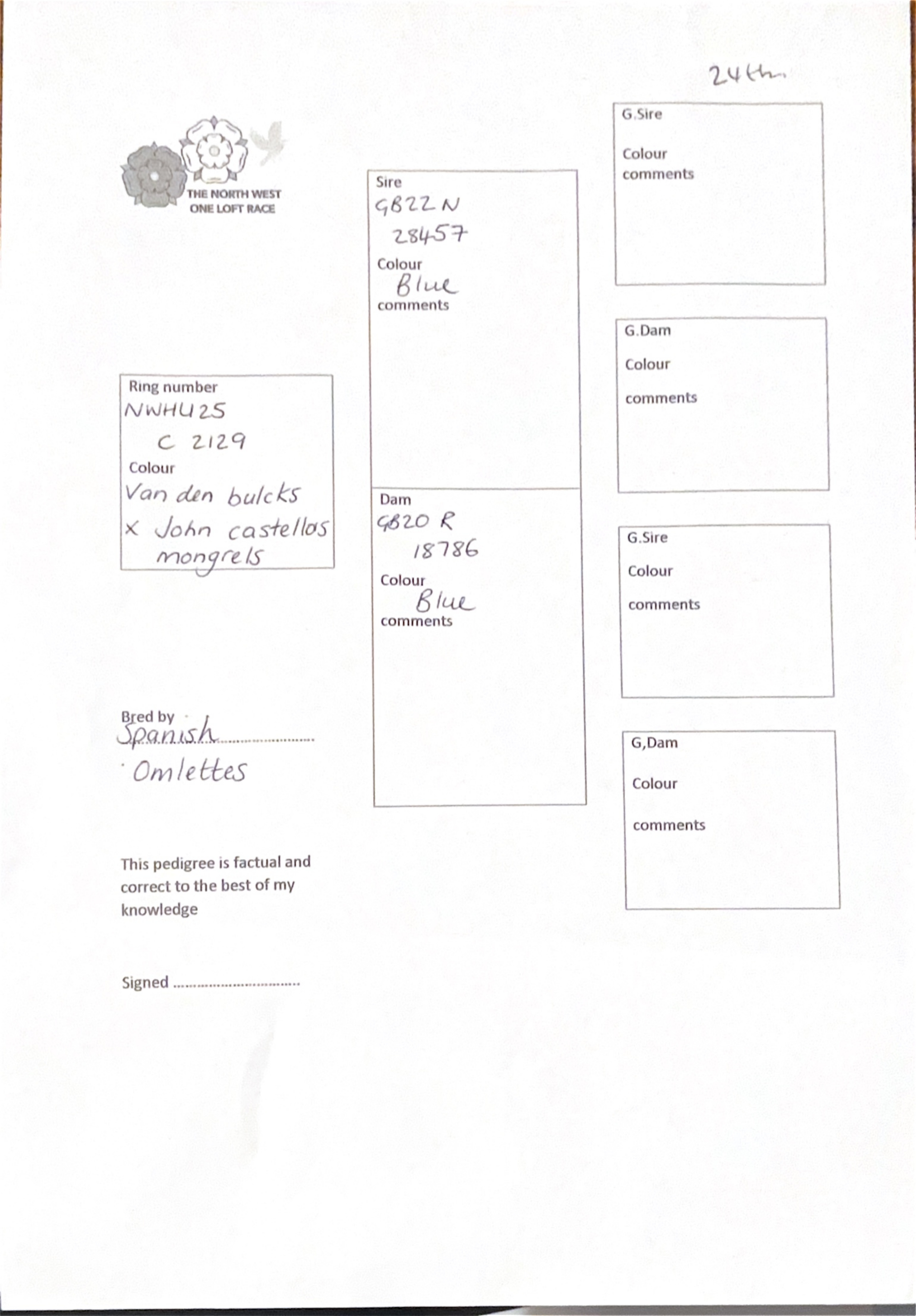 NWHU 25 C2129 Blue “Stunner” winner of 24th Open Grand Final Yeovil and this really consistent pigeon won 2nd ACE PIGEON and was 21st HS1, 13th HS2, 62nd HS3 and 24th Semi Final’ she is yet another one for ‘Spanish Omelettes’