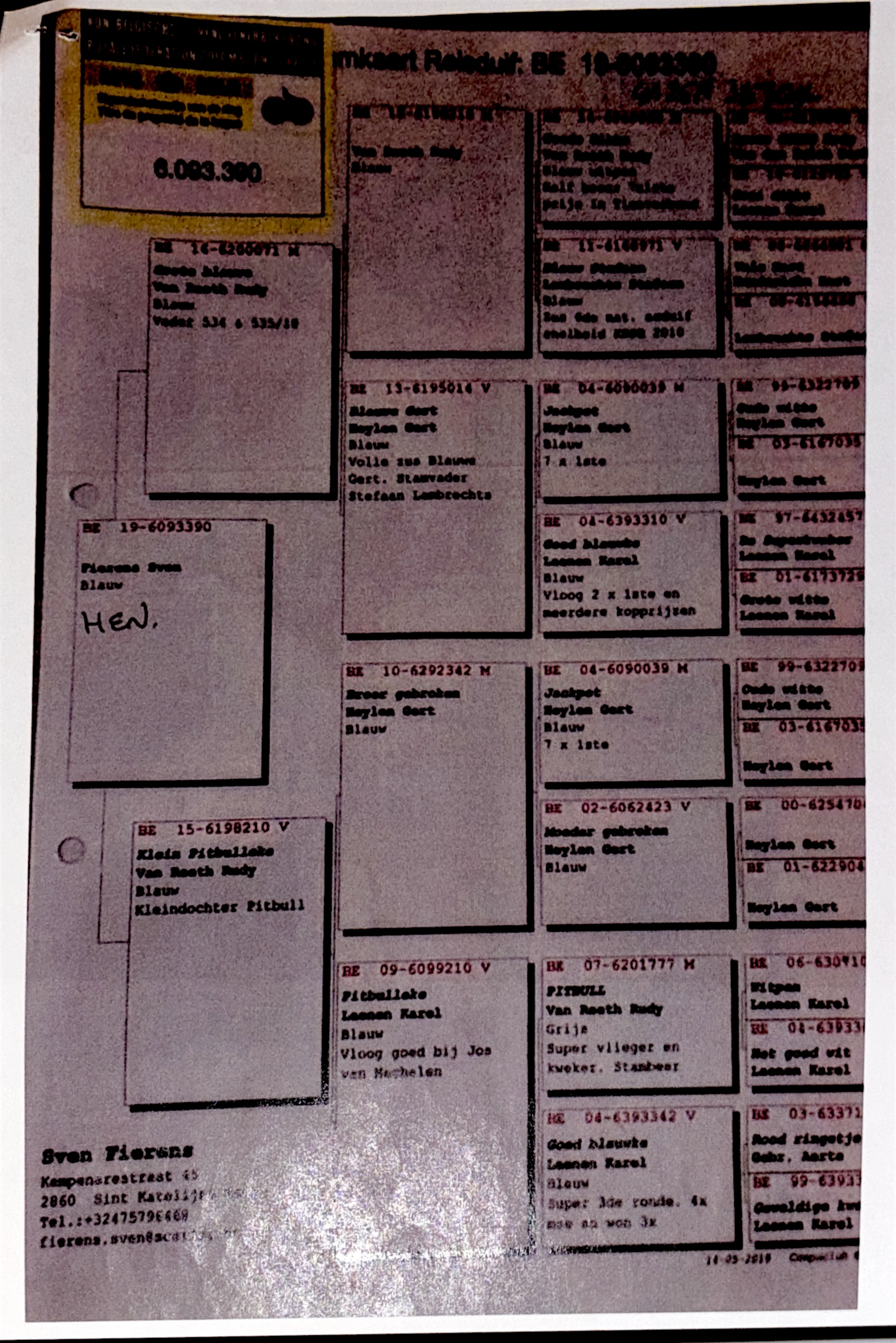 Belge 18 6071534 he is of Rudy Van Reeth and Stefaan Lambrechts breeding. He is bred from the lines of Vale Bart, Brother Goede Rode, Jackpot, Pitbull, Brother Donker Leo, Kleine Dirk and Donker Bart.