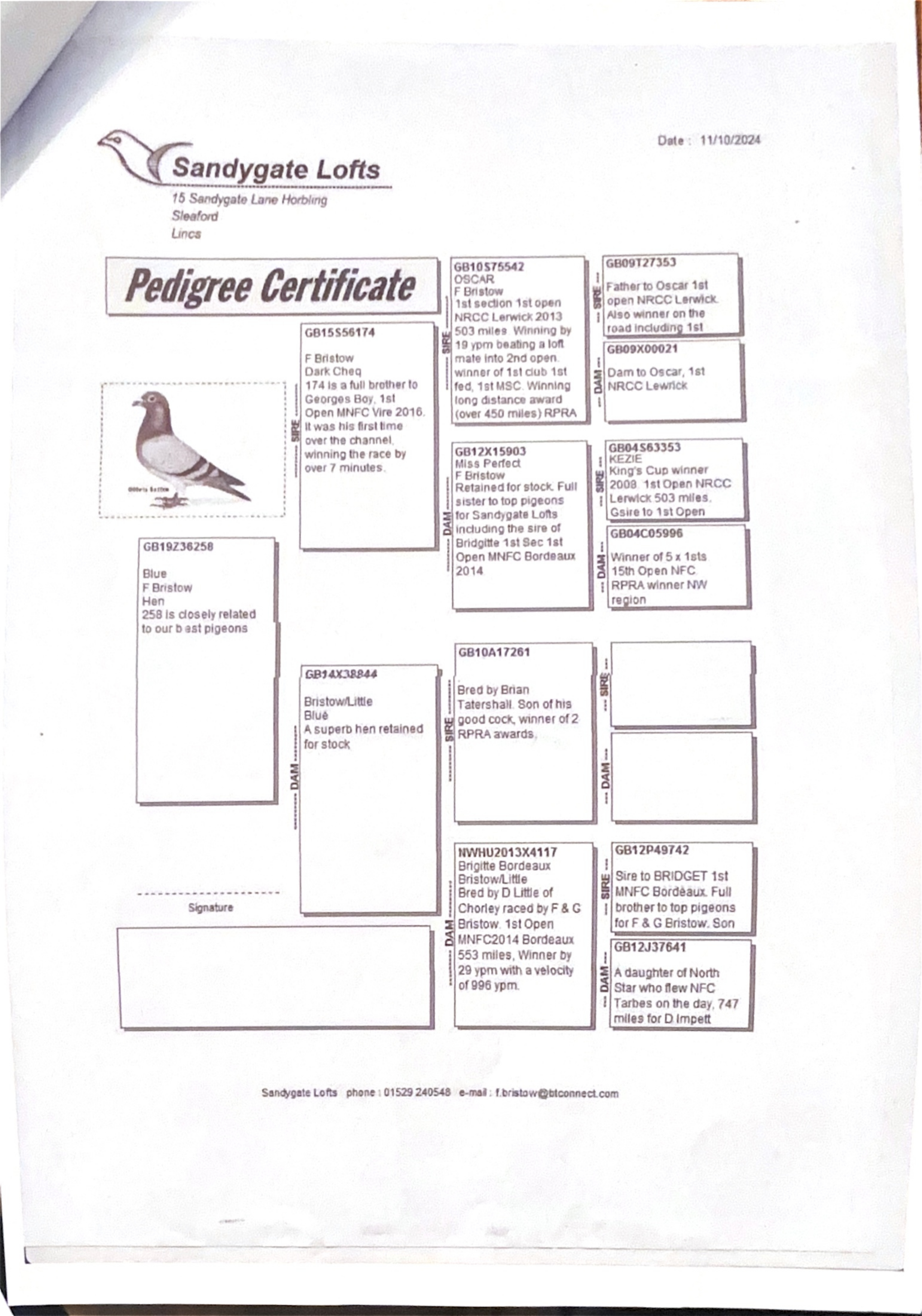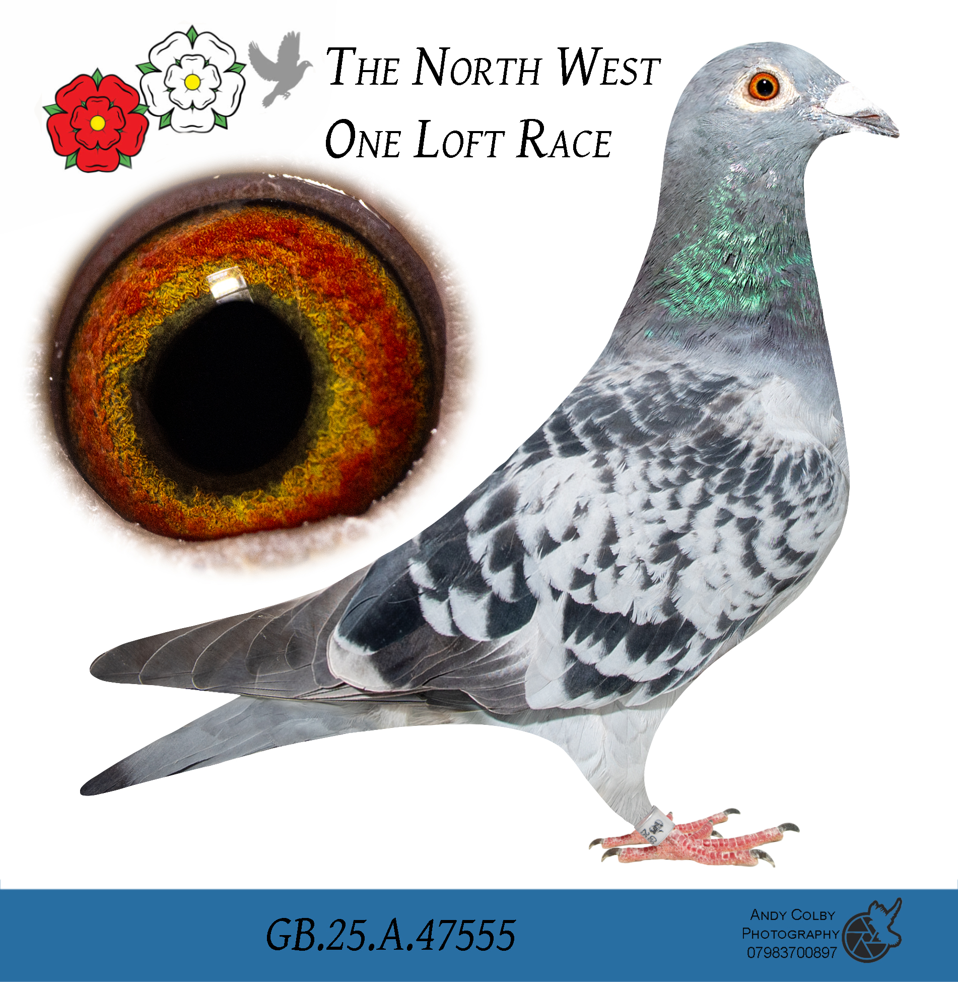 GB 25 A47555 Cheq Hen “Garrison Savannah” winner of 64th Open Grand Final Yeovil and 47th ACE PIGEON winning 37th HS1, 27th HS2, 80th HS3 and 102nd Semi-Final. Both parents were bred by Frank Bristow from his Dirk Vervoort pigeons. This hen was entered by the Dyer Family Lofts.