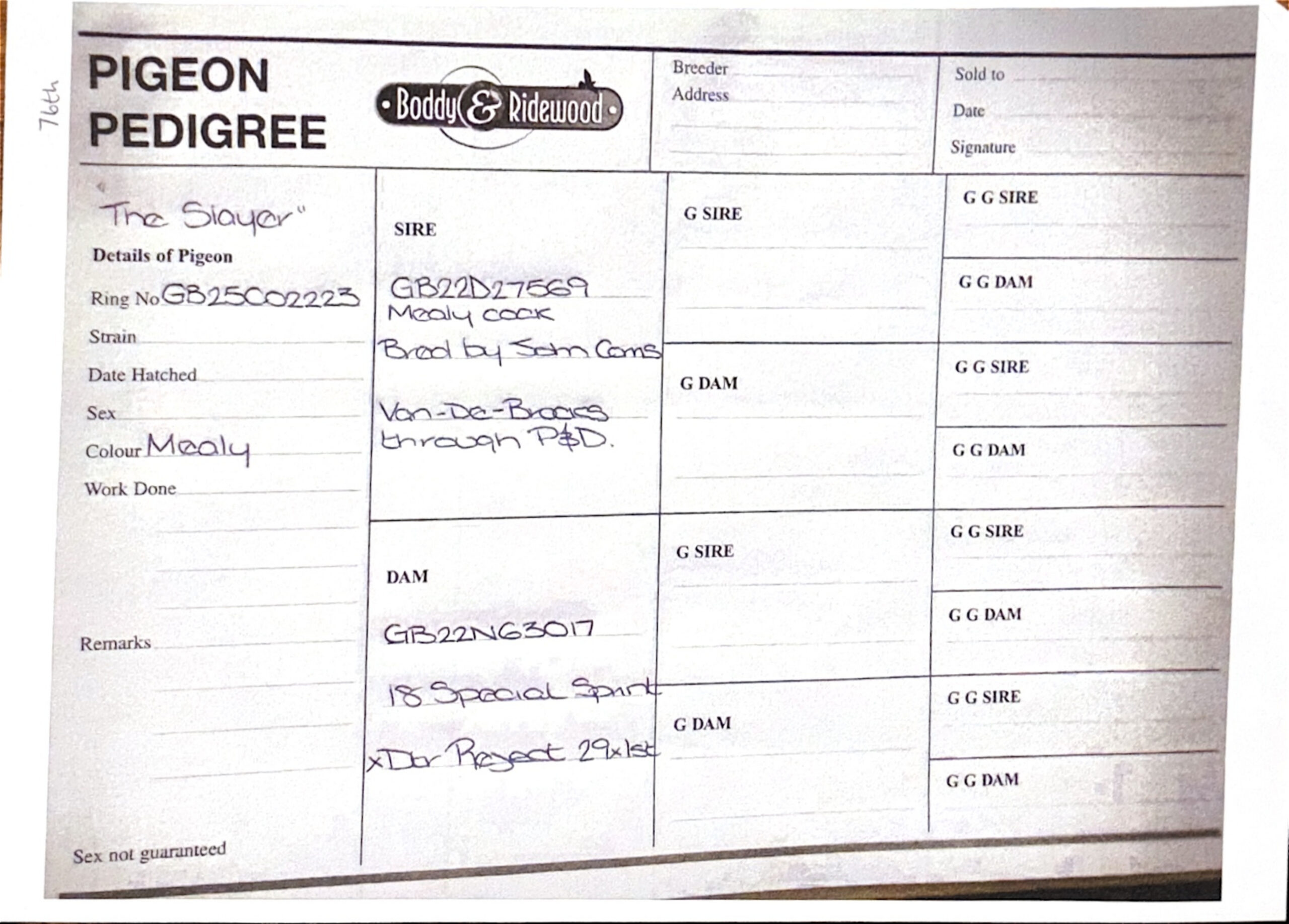 GB 25 C02223 Mealy Hen “The Slayer” winner of 76th Open Grand Final Yeovil and winner of 53rd ACE PIGEON winning 16th HS1, 41st HS2, 51st HS3 and 93rd in the Semi-Final. She is a lovely hen that really couldn’t do herself justice in the later stages of racing because of her heavy moulting. She will really become a golden breeder.