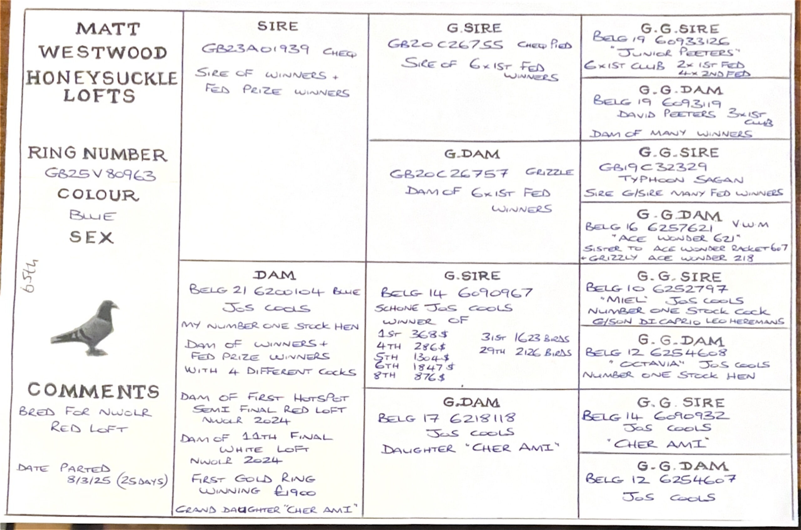 GB 23 A01939 he is sire to winners and to Fed prize winners. His parents are 20/755 and 20/757 they have bred 6 X 1st Fed winners and come from direct David Peeters pigeons. Their parents being Junior Peeters, Typhoon Sagan, Ace Wonder 621 and 19/3119 (3 X 1st Clubs.