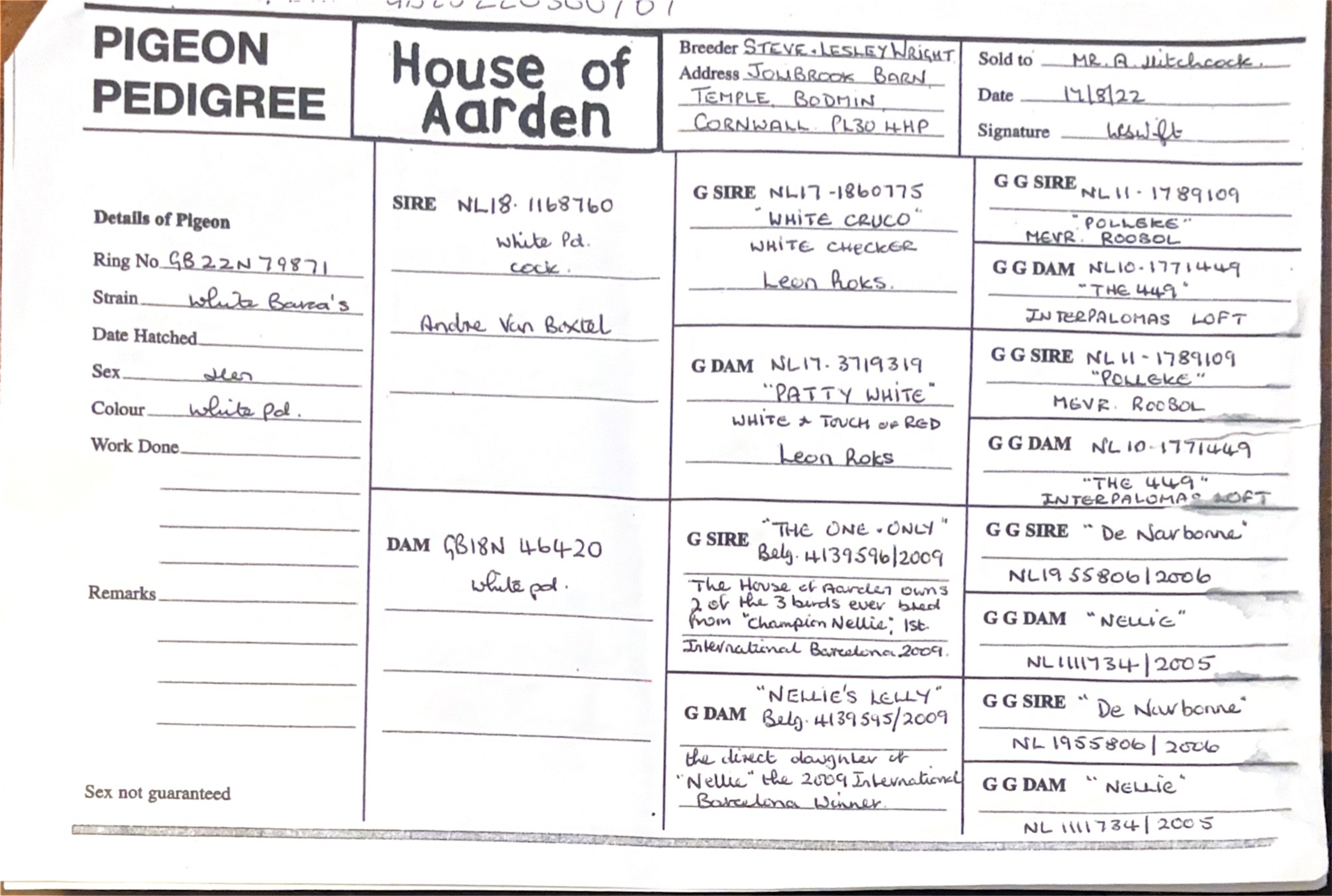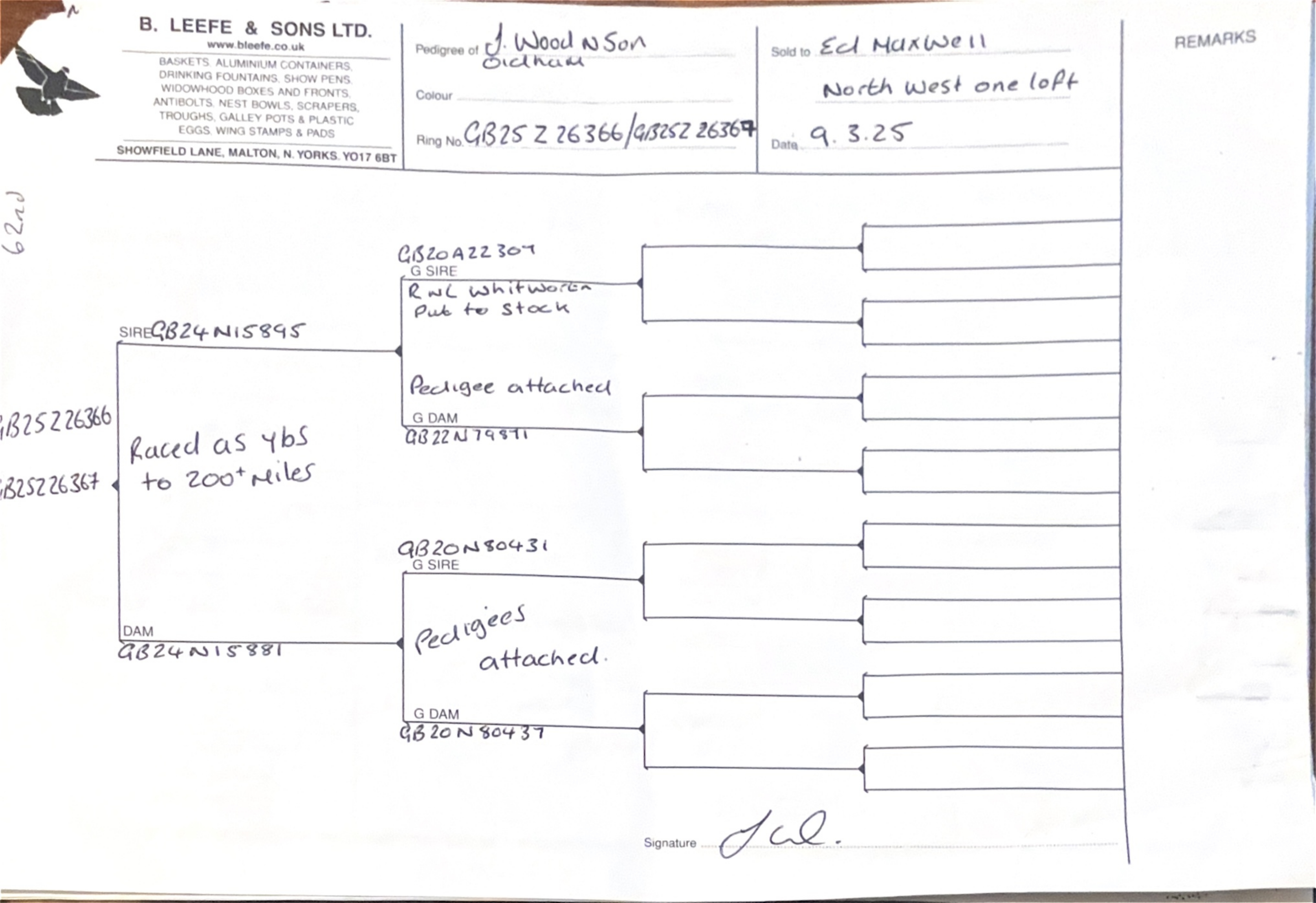 GB 24 N15895 he is a son from 20 A22307 from R & L Whitworth and his mother is 22 N79871 from House Of Aarden stock.
