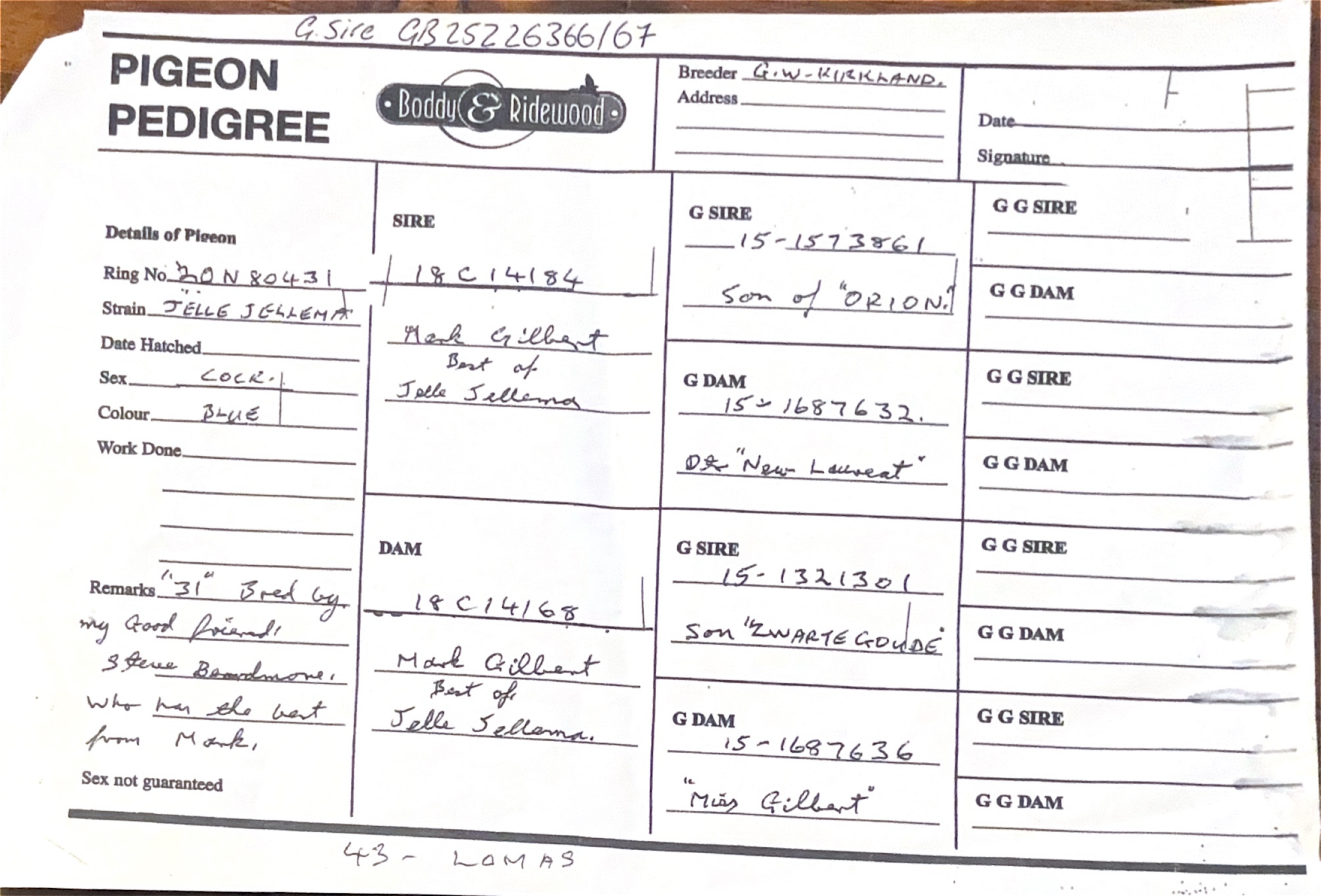 GB 24 N15881 her father is 20 N80431 bred from Mark Gilbert and Jelle Jellema pigeons; she is from the lines of Orion, New Laureaat, Zwarte Goude and Miss Gilbert.