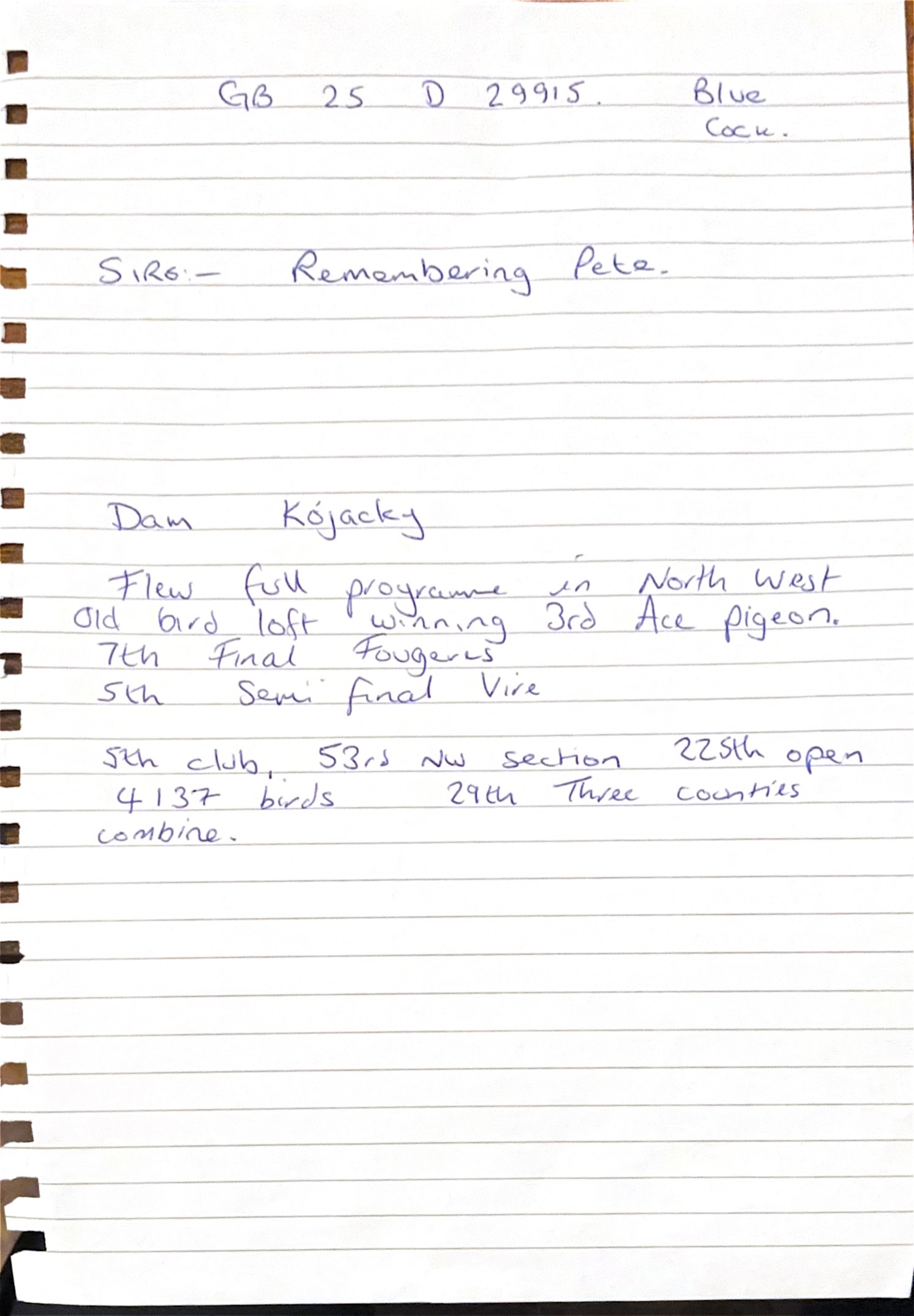 “Kojacky” she flew the full programme in the North West old bird loft winning 3rd Ace Pigeon and 7th in the Final Race from Fougeres, and she was 5th in the Semi-Final from Vire.