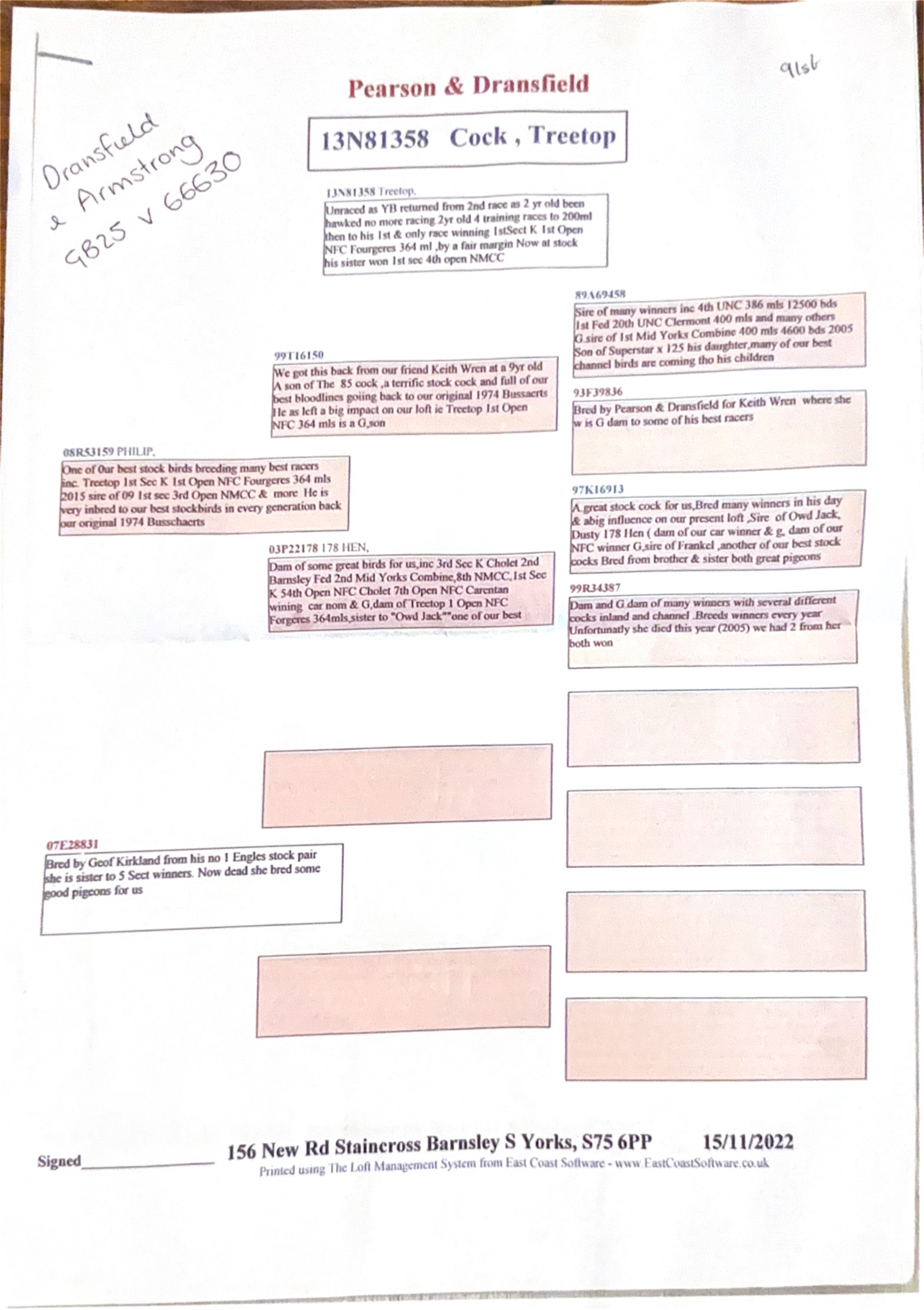 GB 13 N81358 “Treetop” he only ever had one race and won 1st Section K 1st Open NFC Fougeres 364 miles by a fair margin. His sister also won 1st Section, 4th Open NMCC he comes from Pearson & Dransfield stock. His father is one of the best birds of the loft and is bred from two top breeders.