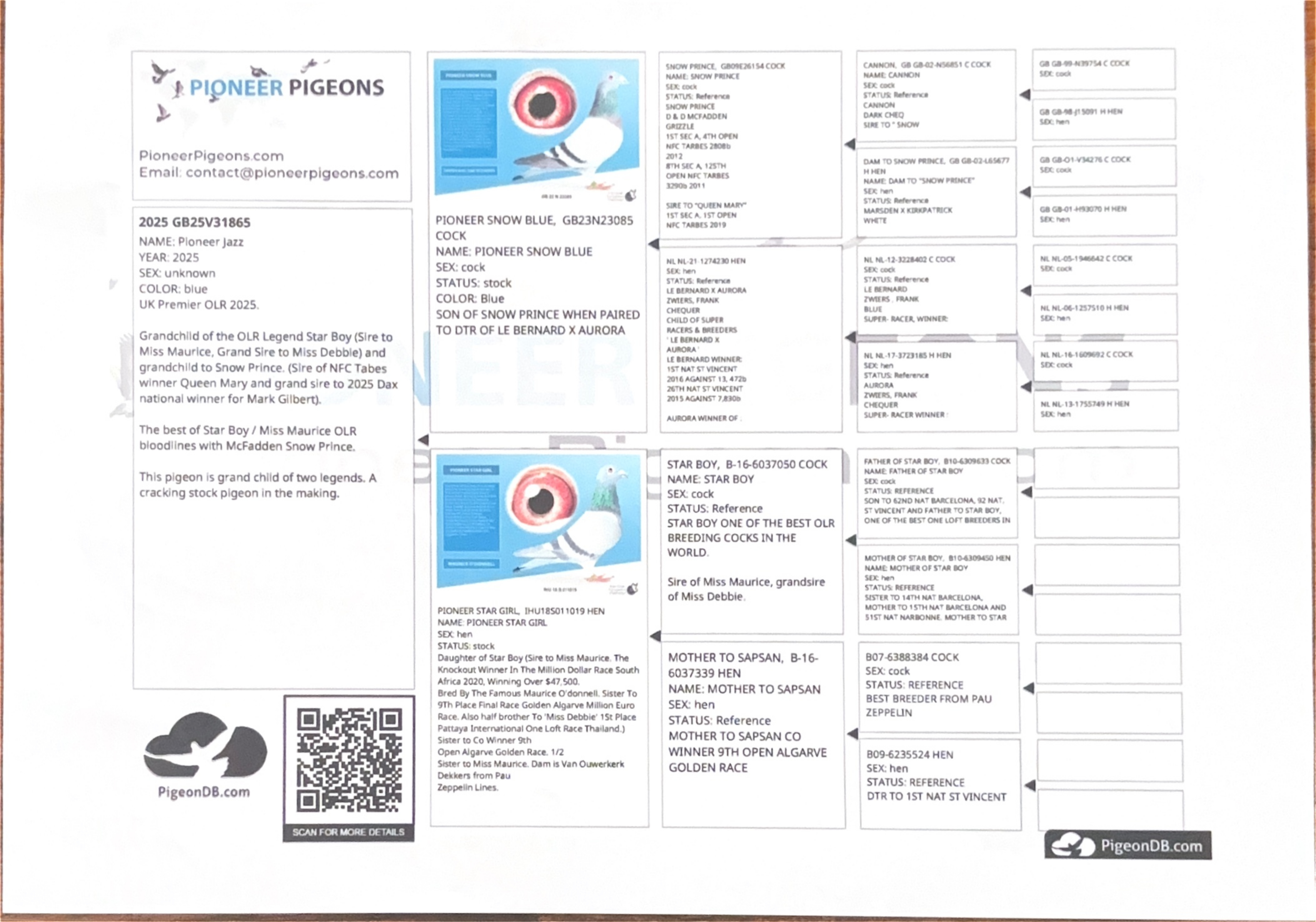 GB 25 V31865 Blue “Pioneer Jazz” winner of 11th Grand Final Arbroath 2025 from 315 miles and Jazz was also 2nd Ace Pigeon and it is the second pigeon in the Ace Pigeon rankings for Pioneer Syndicates Group A that won them the unique prize of £3000, the first pigeon being 6th Open Final Race. Pioneer Jazz is a grandchild of OLR legend “Star Boy”