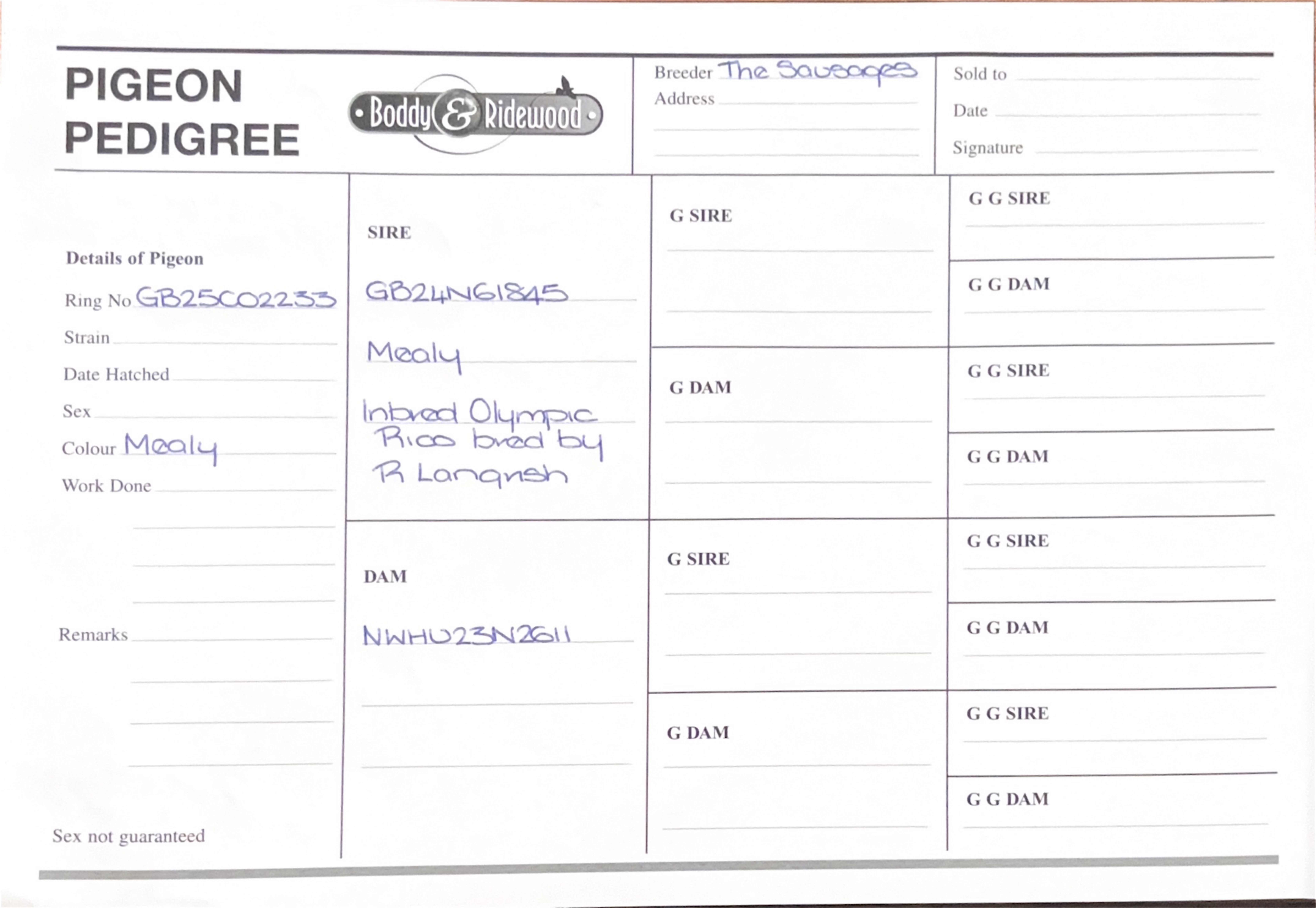 GB 25 C02233 Mealy “Vale Rico” winner of 55th Grand Final Arbroath 2025 from 315 miles and 55th Ace Pigeon for ‘The Sausages’.
