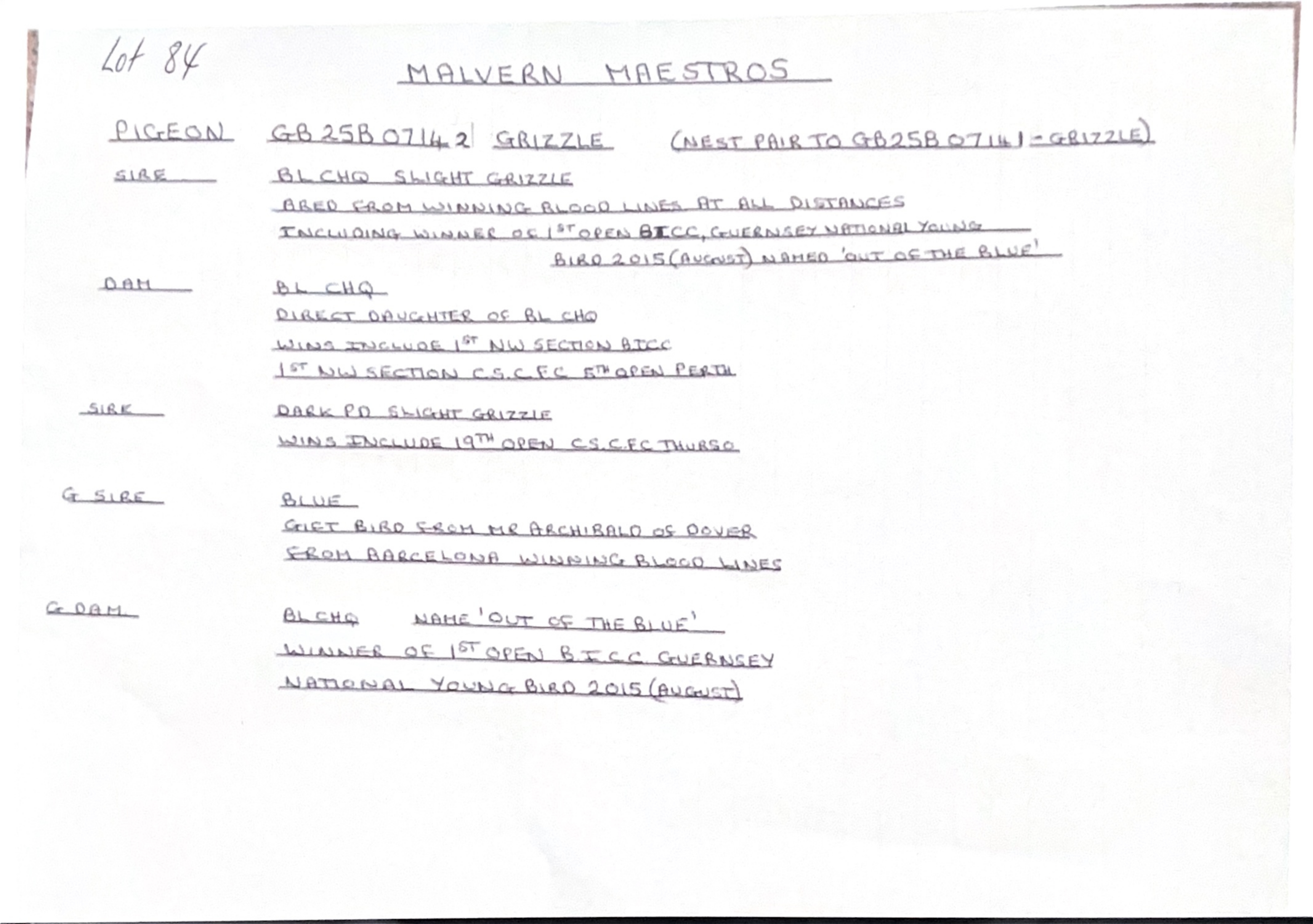 He is a slight grizzle cock bred from a winning line at all distances including the winner of 1st Open BICC Guernsey YB National named ‘Out Of The Blue’