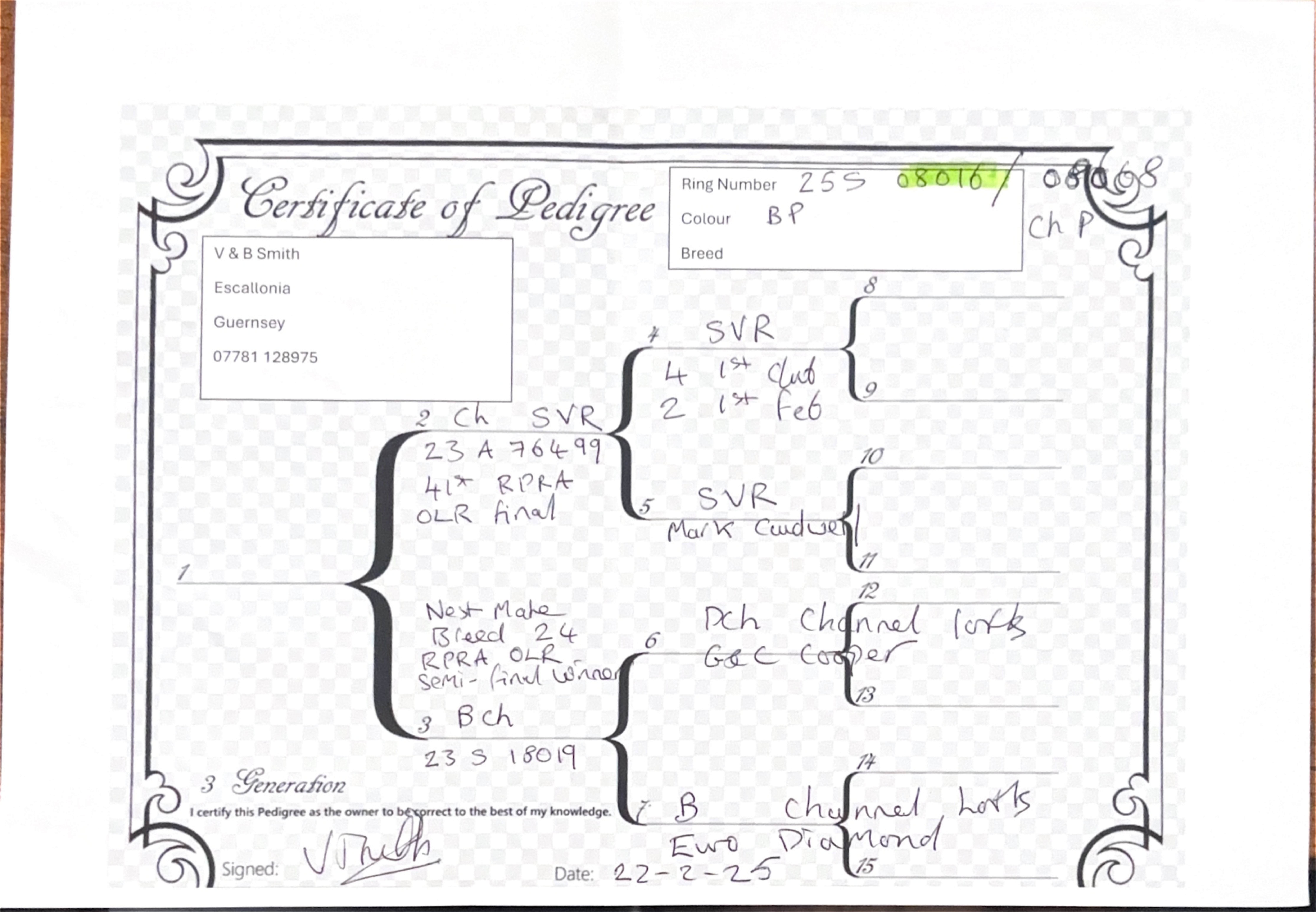 23 A76499 he was 41st in the RPRA One Loft Race final; his father is a SVR and a winner of 4 X 1st club and 2 X 1st fed. His mother is a SVR from Mark Caudwell.
