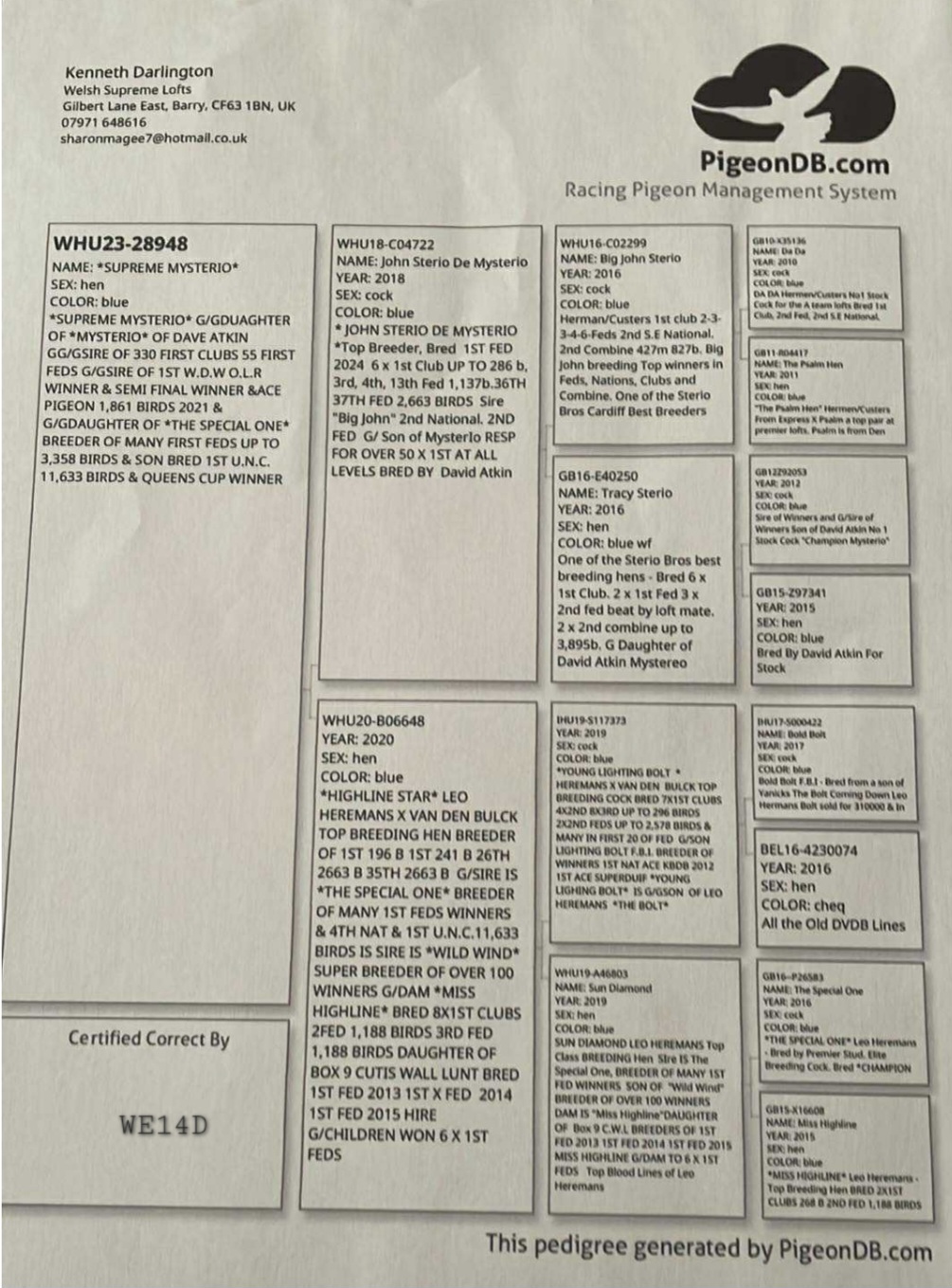 WHU23-28948 “Supreme Mysterio”Blue Hen, G.G.Daughter of “Mysterio” of Dave Atkin“The Special One” bloodline – proven breeder of 1st prize winners up to 3,358 birds, including National & Federation champions Bred for performance, durability, and consistencyThis pigeon combines: Speed & drive from the Bolt / Van Den Bulck lineEndurance & reliability from the Mysterio family Together, these genes produce pigeons that excel in top-level OLR racing – proven by this bird’s Grand Final & Ace Pigeon results in the Welsh Elite 2025. The last 3 competitive races for this pigeon showed improvements each week. 96th 48th then 14th. Perhaps another race further again would showcase an even better end to the season. There can be bo doubt this pigeon has everything you could ever ask for and more.Descends from bloodlines responsible for over 330 x 1st Club & Fed winners 1st W.O.L.R. Winner & Semi-Final Winner, Ace Pigeon 1,861 Birds (2021, Queens Cup Winners plus many more.