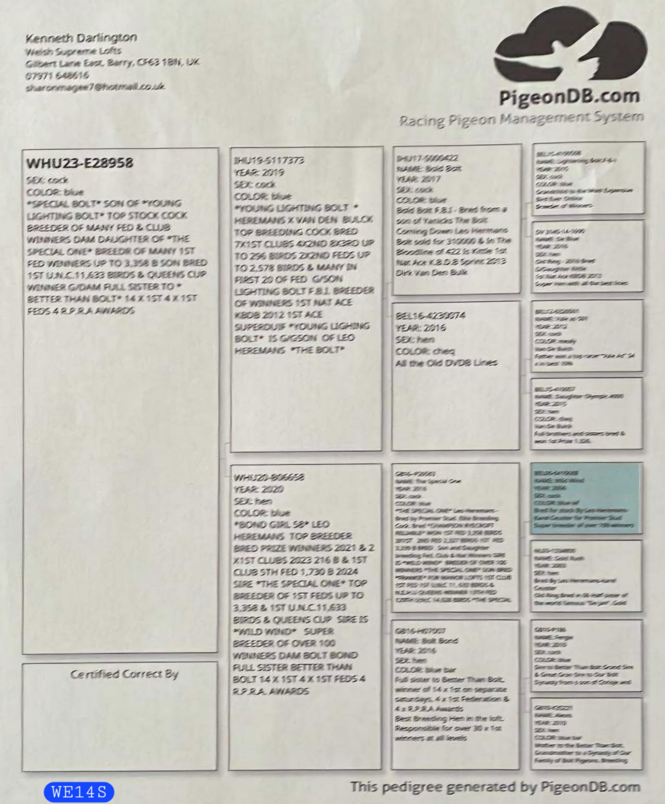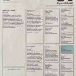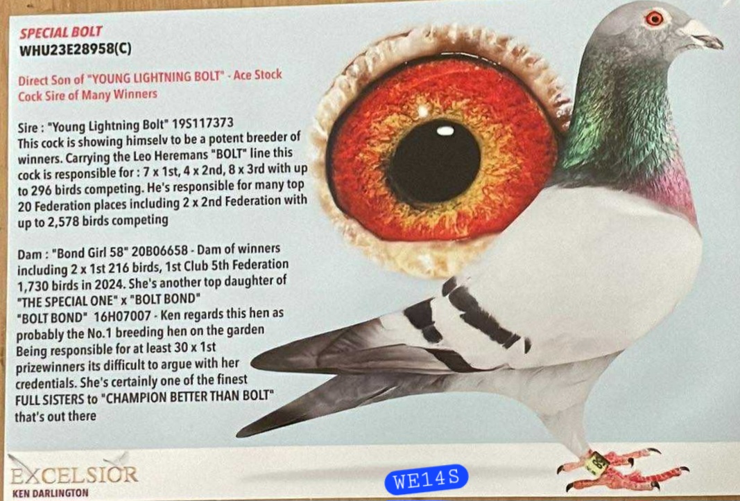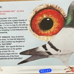 WHU23-E28958 “Special Bolt”Blue Cock – direct son of “Young Lightning Bolt” (Hermans x Van Den Bulck)“Young Lightning Bolt” – breeder of many 1st Club & Fed winners, up to 2,579 birds, and 1st Ace PigeonsGrandson of Leo Heremans’ “The Bolt” – world-renowned for his speed and consistencyThe GDam “Bolt Bond” – full sister to “Better Than Bolt”, responsible for 14 x 1st, 4 x 1st Feds, and 4 x RPRA AwardsLinebred to The Bolt / Wild Wind / Best Kittel lines – proven producers of sprint and middle-distance championsDam: