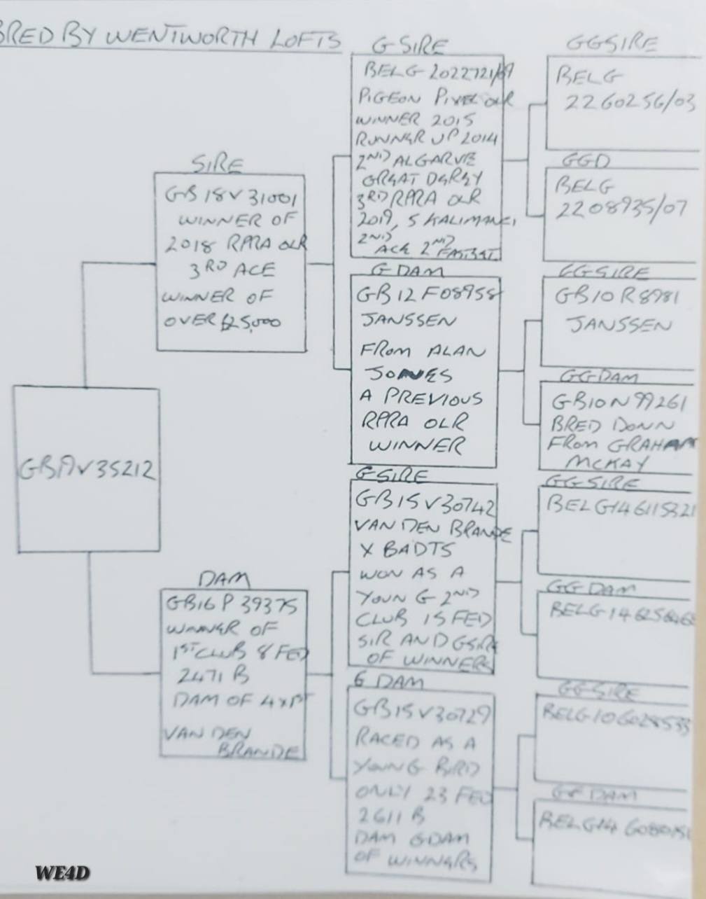 GB 19 V35212 bred by Wentworth Lofts. Her father is a winner of 3 rd Ace Pigeon and £2,500