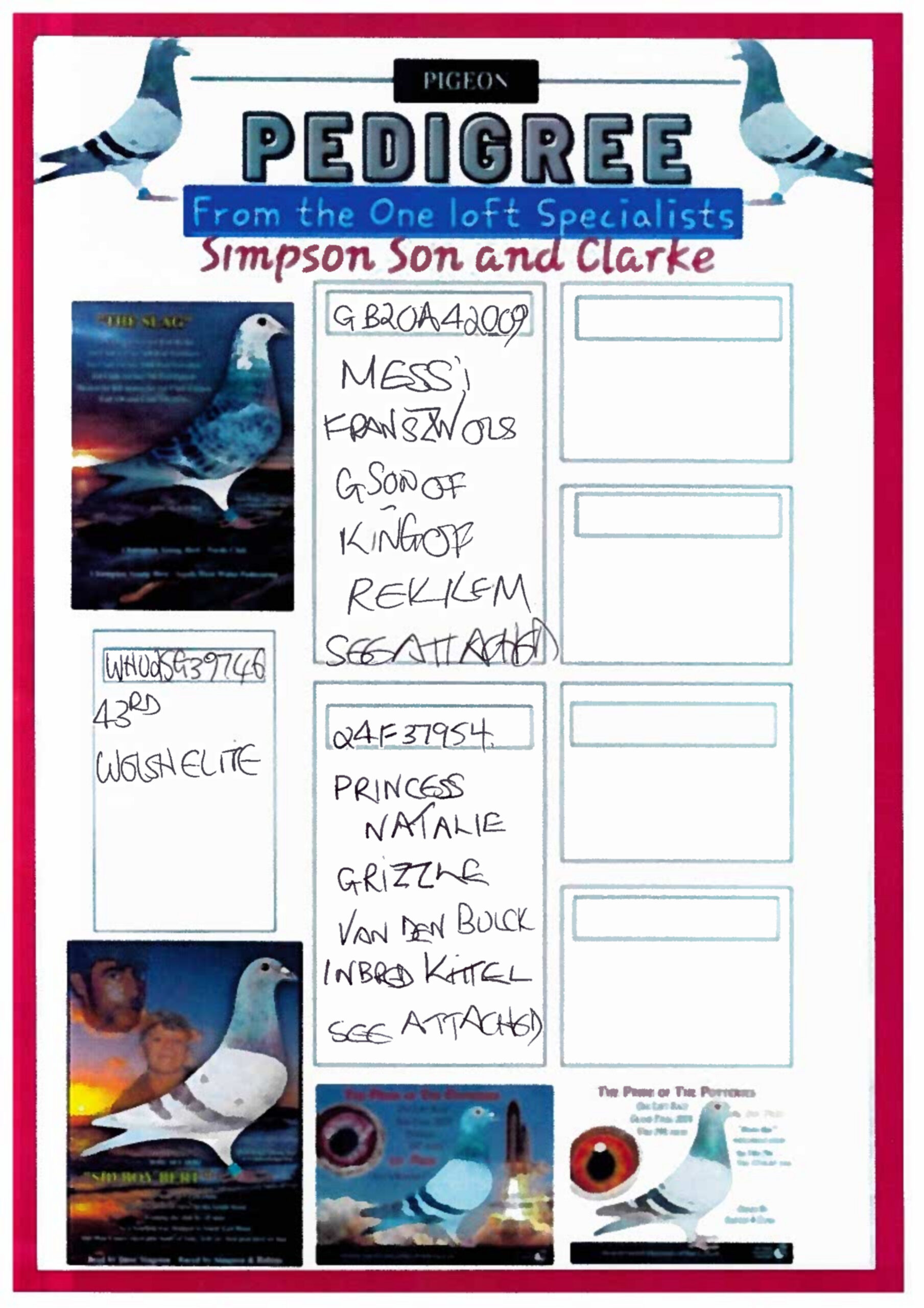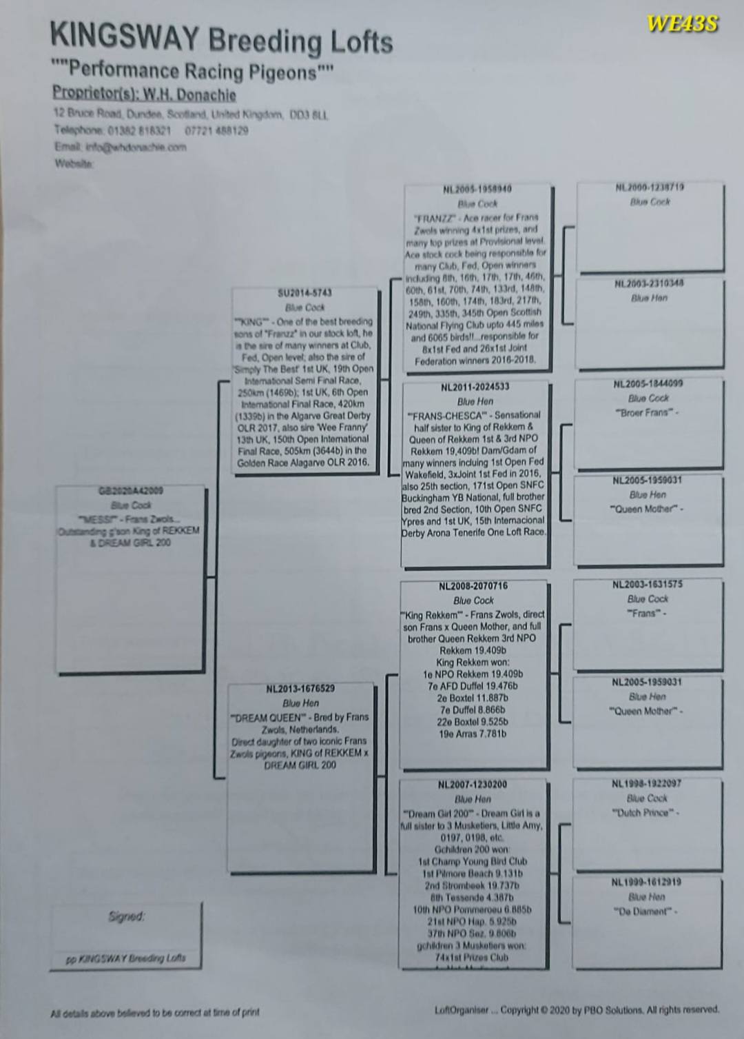 Direct from the lofts of Kingsway Breeding Lofts, this cock carries the elite Frans Zwols bloodlines. He is a son of “King of Rekkem” and “Dream Girl 200”, responsible for multiple federation and national performers.