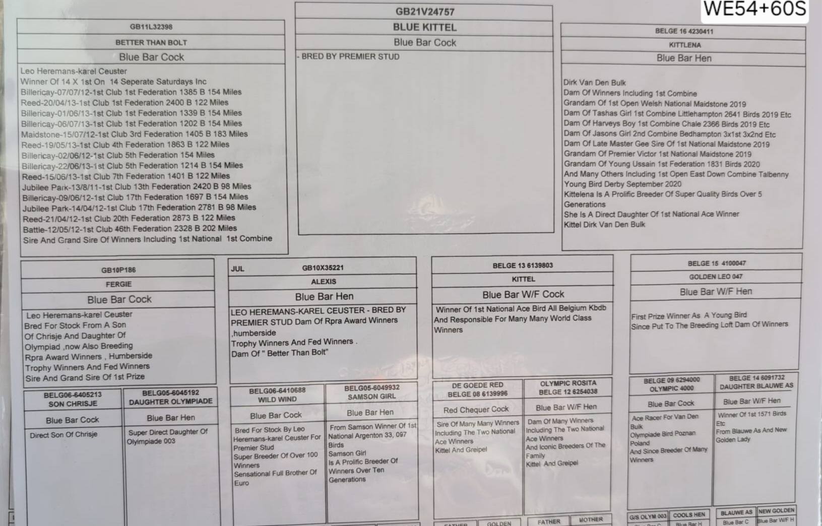 - Sire GB17Z47219 “MacQueen”, a Speed Freak Winner, 1st Federation 2,211 birds, 2nd Fed 1,182 birds, now top breeder of multiple 1st prize winners.