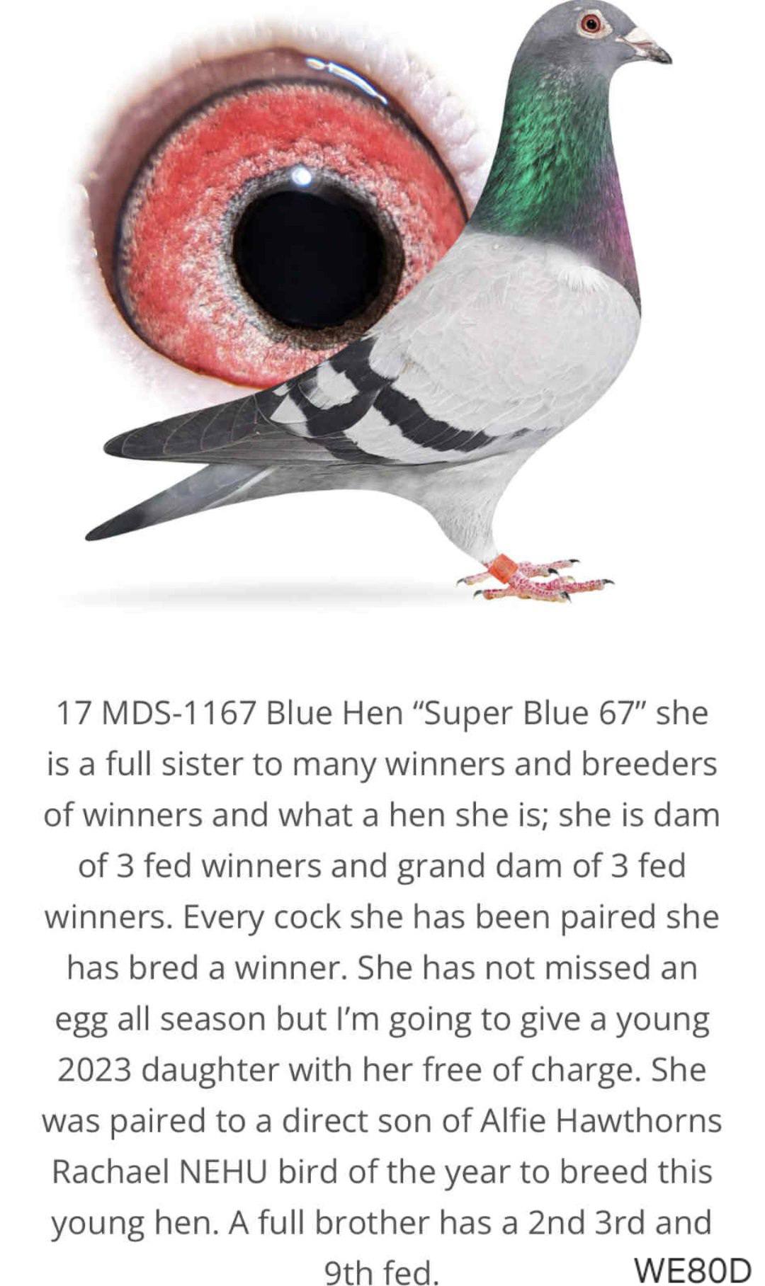 • Paired in 2023 to a direct son of Alfie Hawthorn’s Rachael (NEHU Bird of the Year)